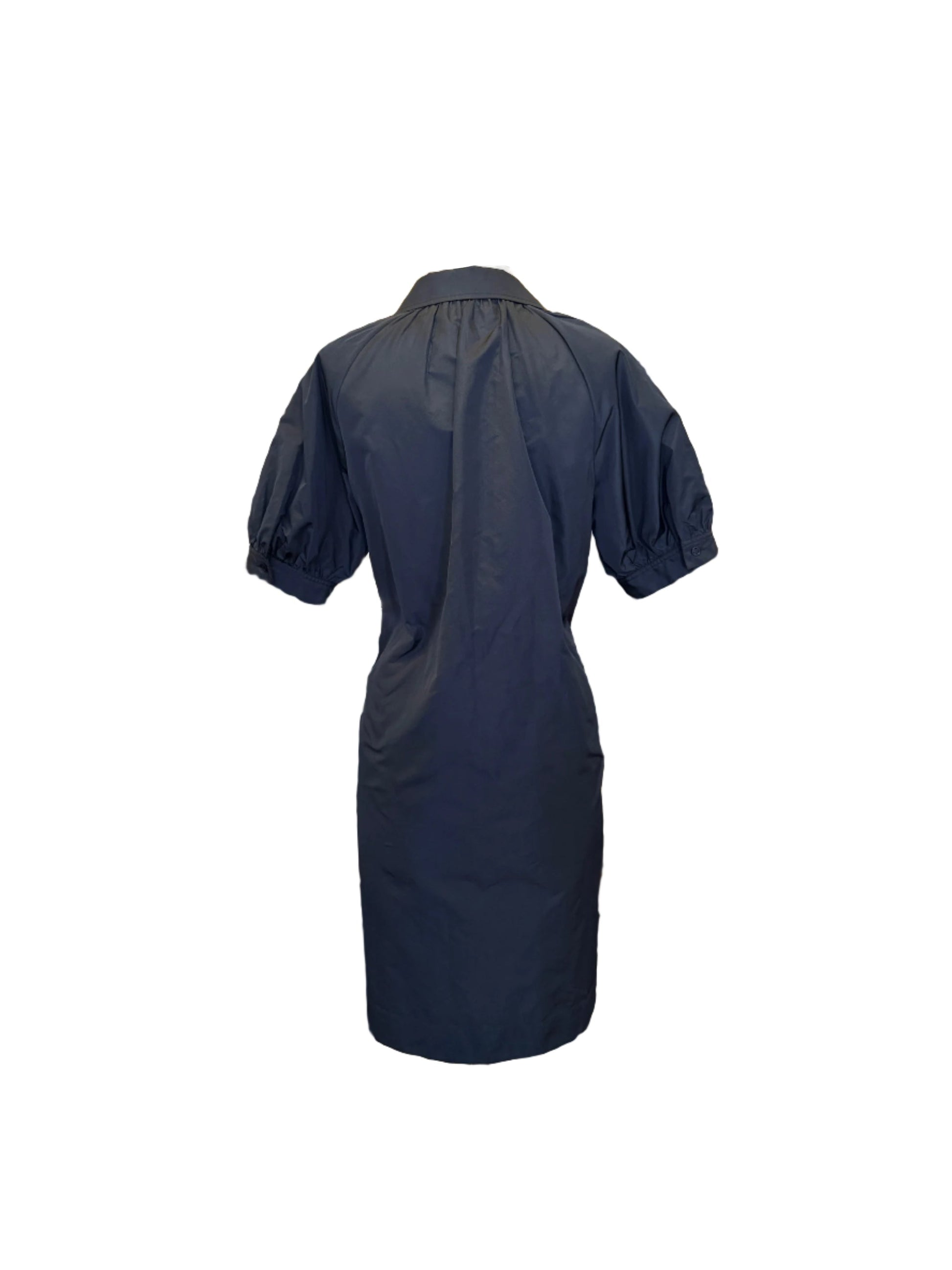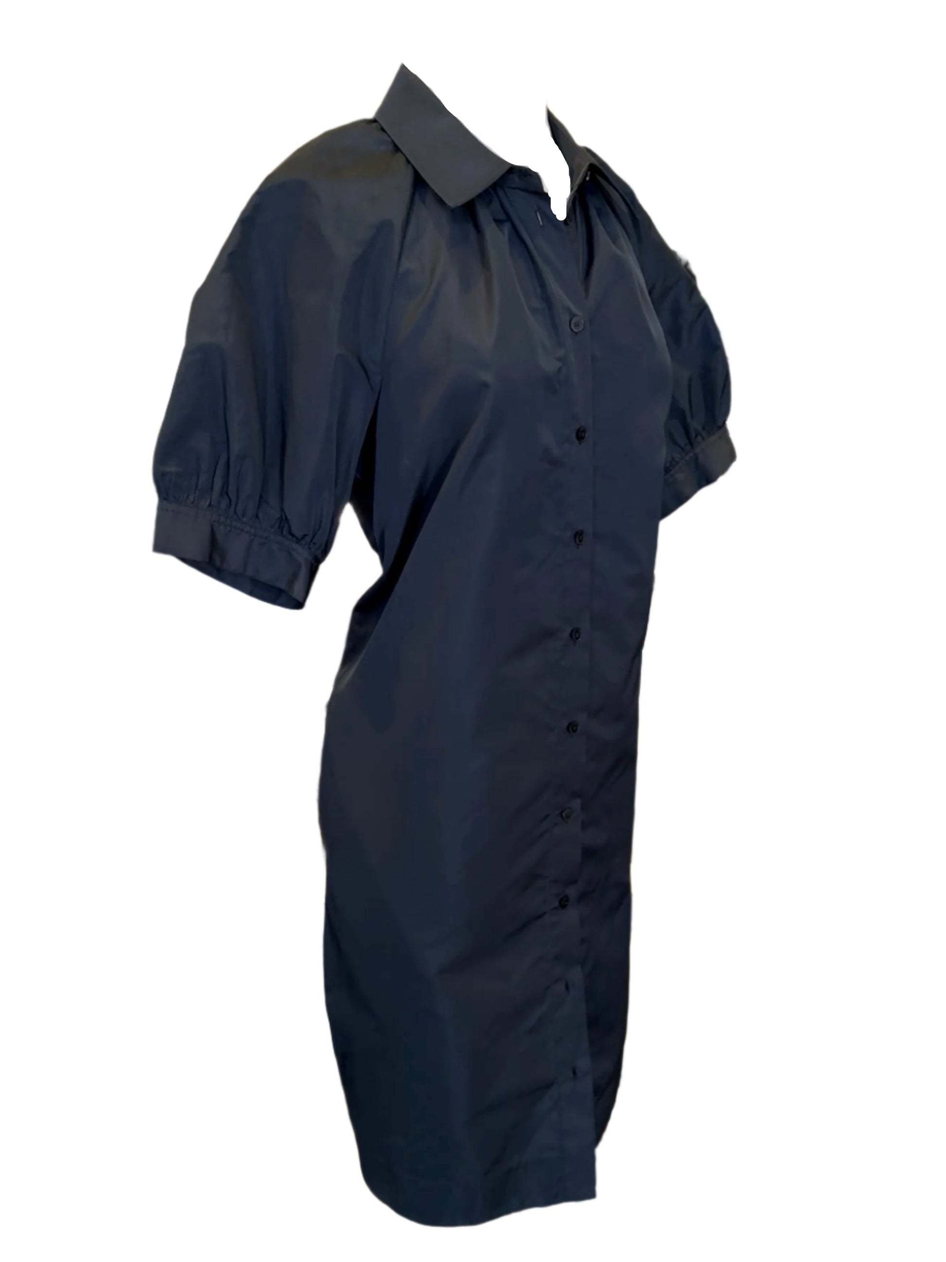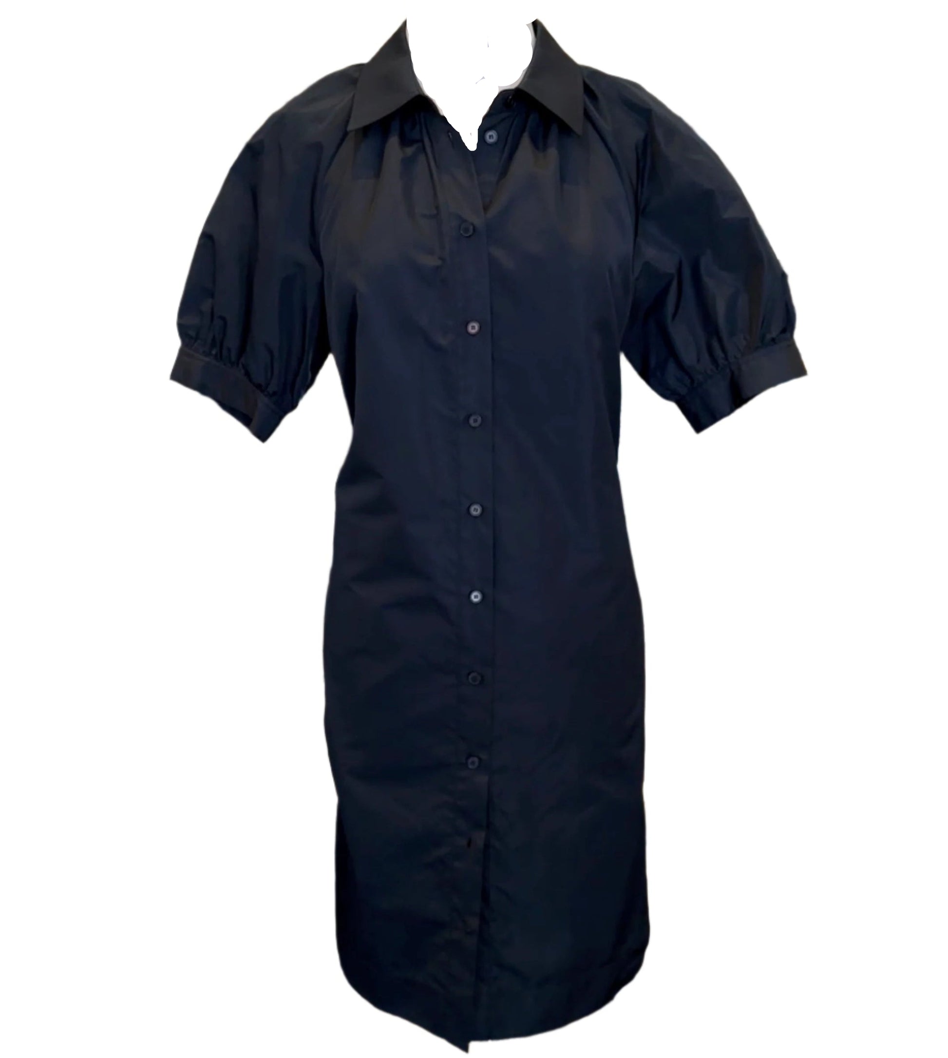 This is an authentic LAFAYETTE 148 Short Sleeve Dress. This chic dress features puffed sleeves, buttons all down the front of the dress, and a collar.