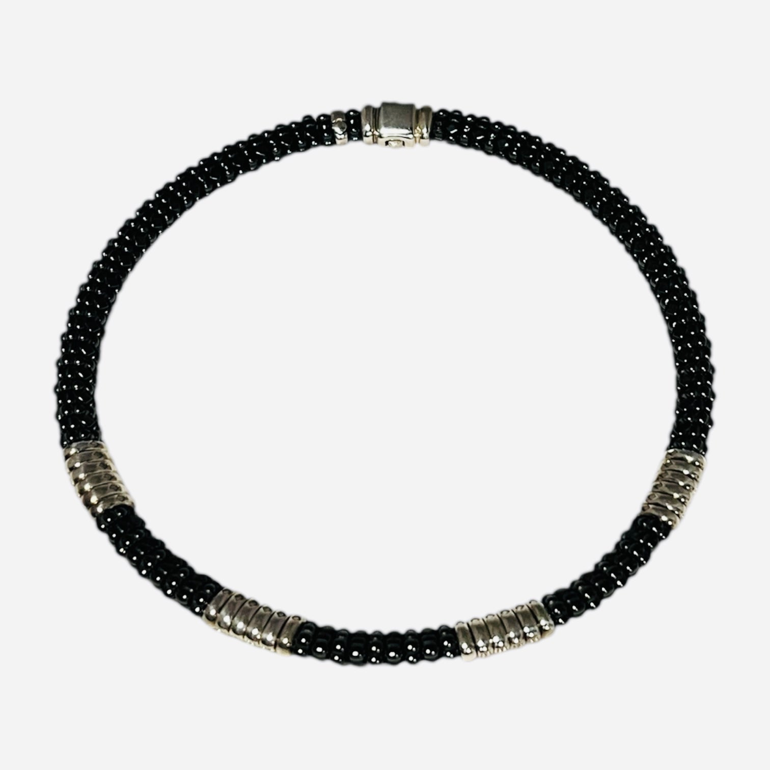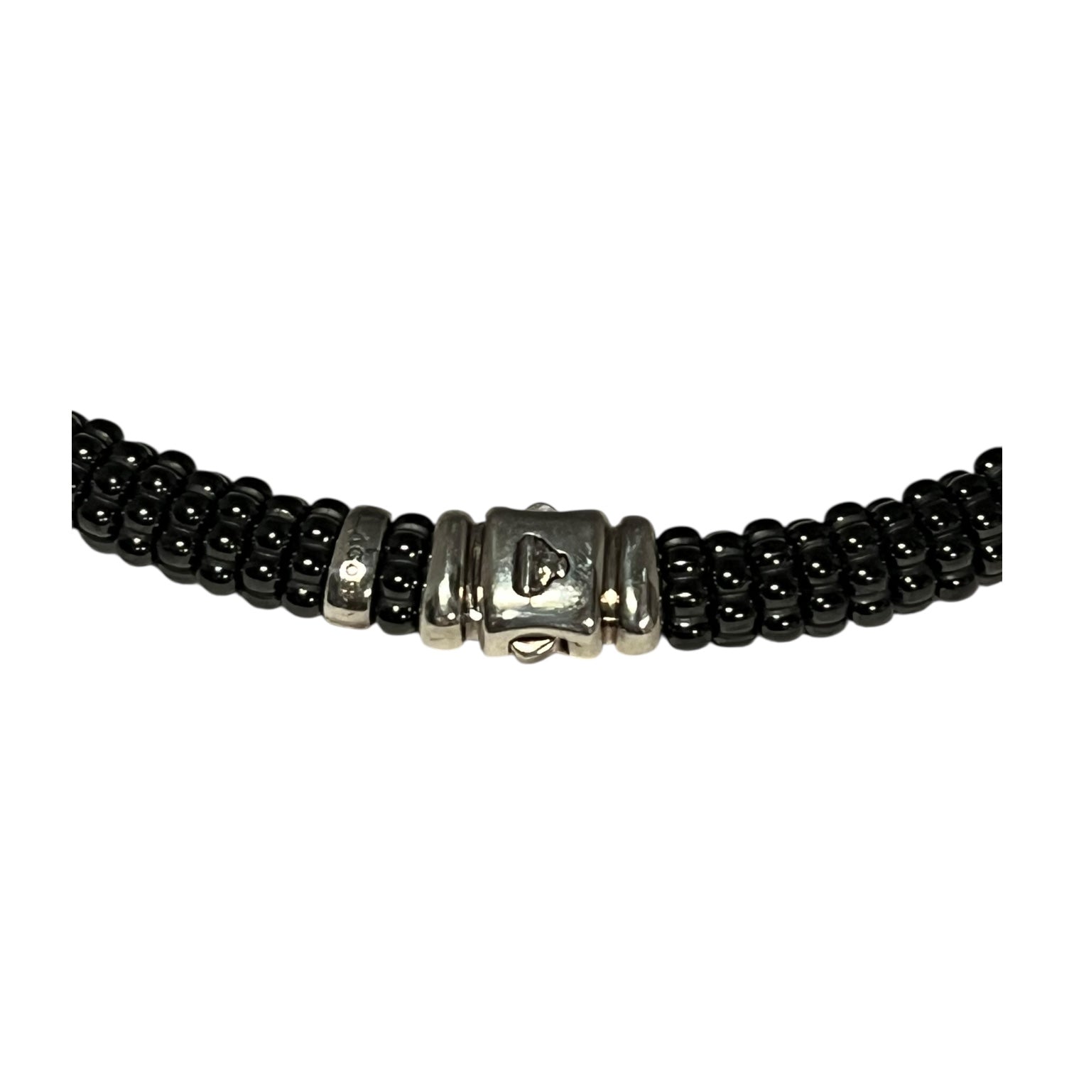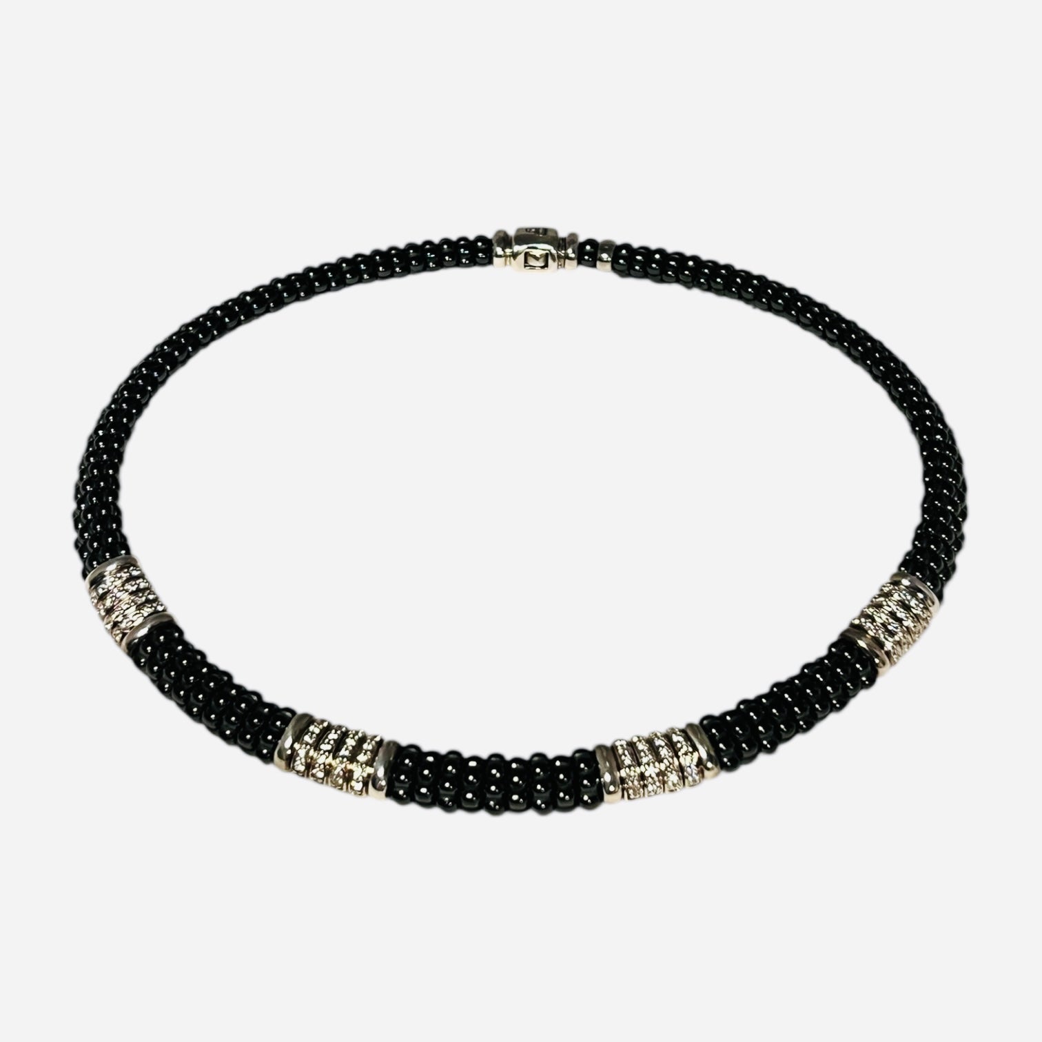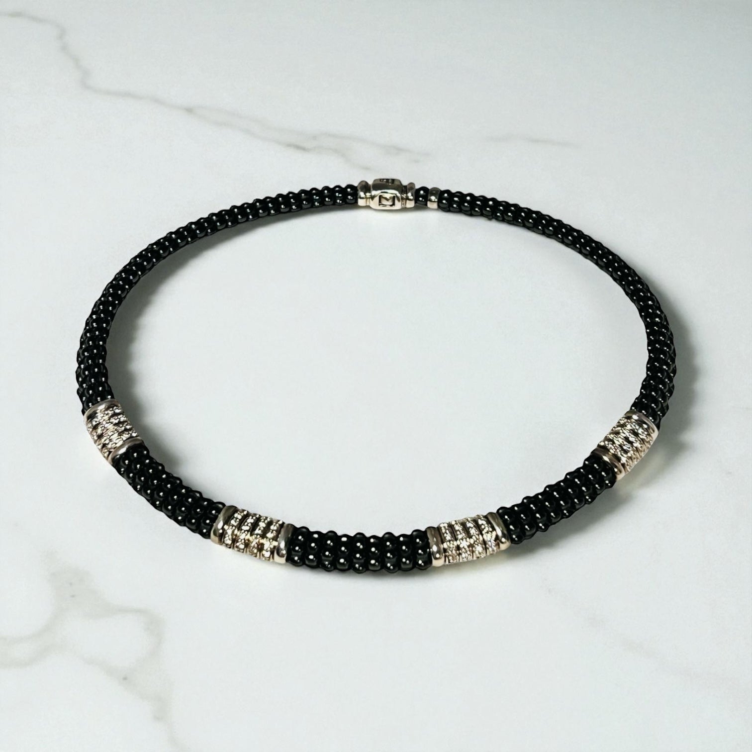 This is an authentic LAGOS Diamond Station Necklace in black caviar ceramic features four diamond stations set in sterling silver and a pushlock closure. Choker silhouette.