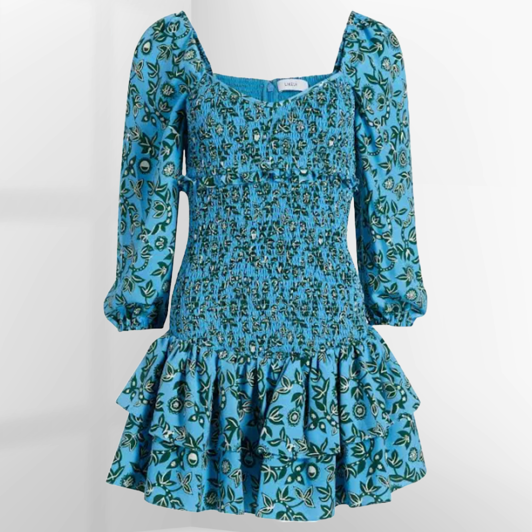 The Likely Women's Darby Mini Dress is a long-sleeve, floral dress made of 100% polyester. It has a sweetheart neckline, a smocked bodice, ruffle trim, elastic shoulders and cuffs, and a flounce hem. The dress is lined with 95% polyester and 5% spandex for a smooth fit. It has a center back zipper with a hook-and-eye closure for easy on and off.