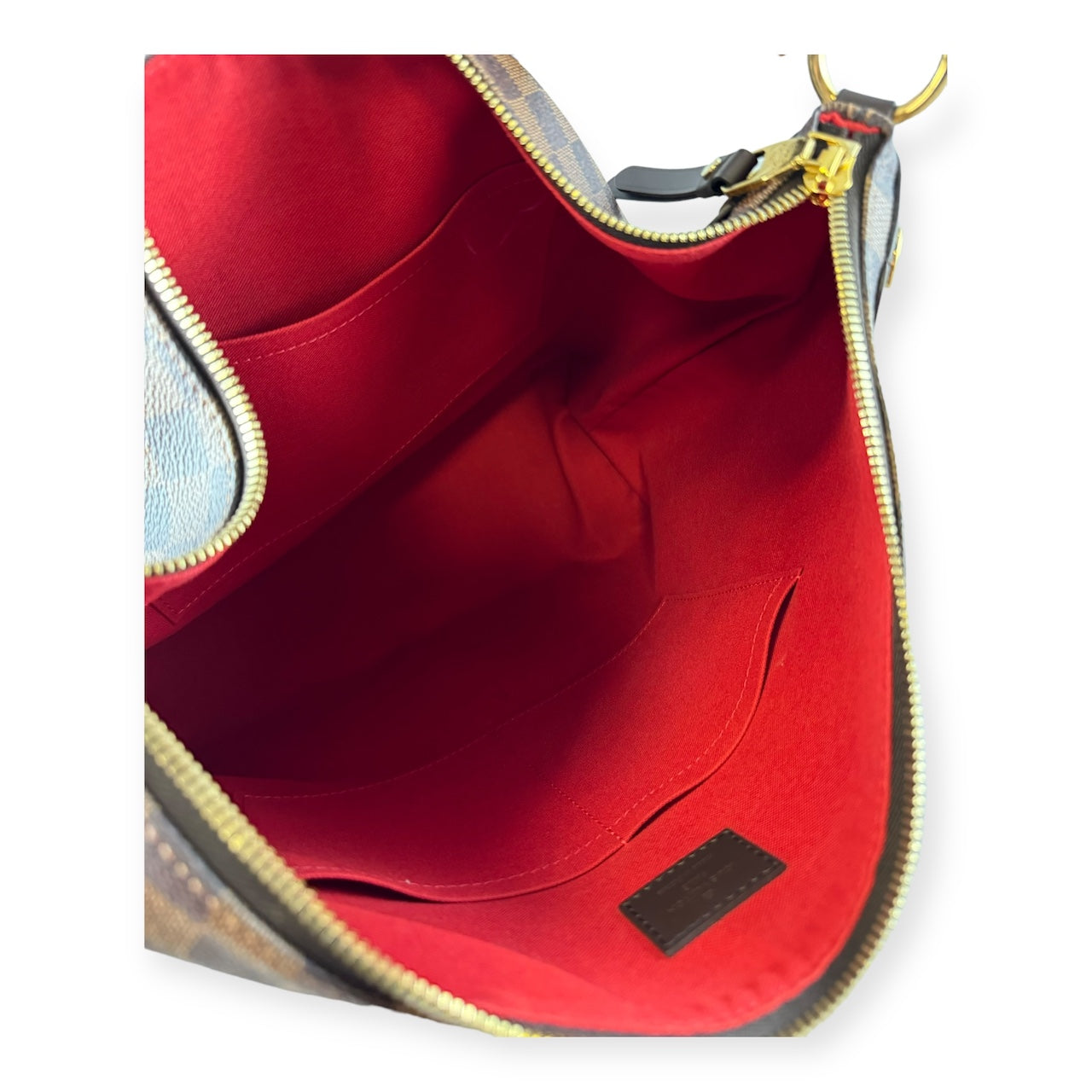 This is an authentic LOUIS VUITTON Duomo Shoulder Bag Damier Ebene. This hobo shoulder bag is crafted of Damier Ebene coated canvas with dark brown leather accents and gold-toned brass hardware. It features a leather shoulder strap, four base studs, a top zipper closure, and a spacious red fabric interior with three patch pockets and one key ring.