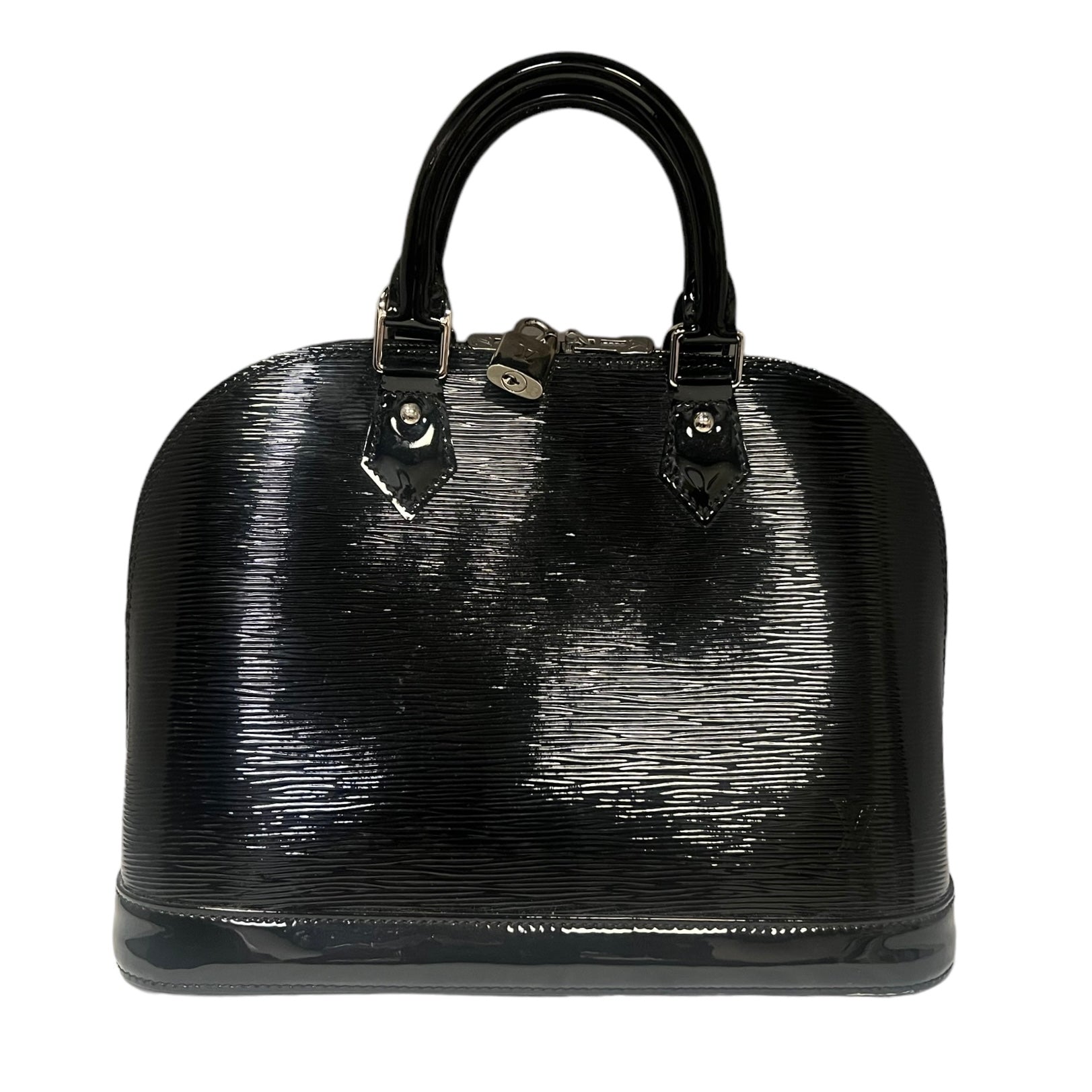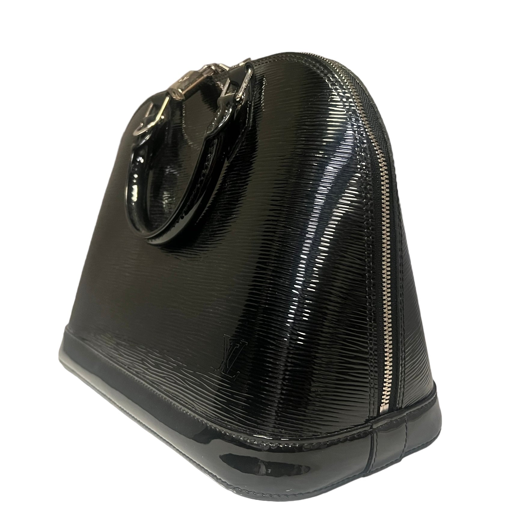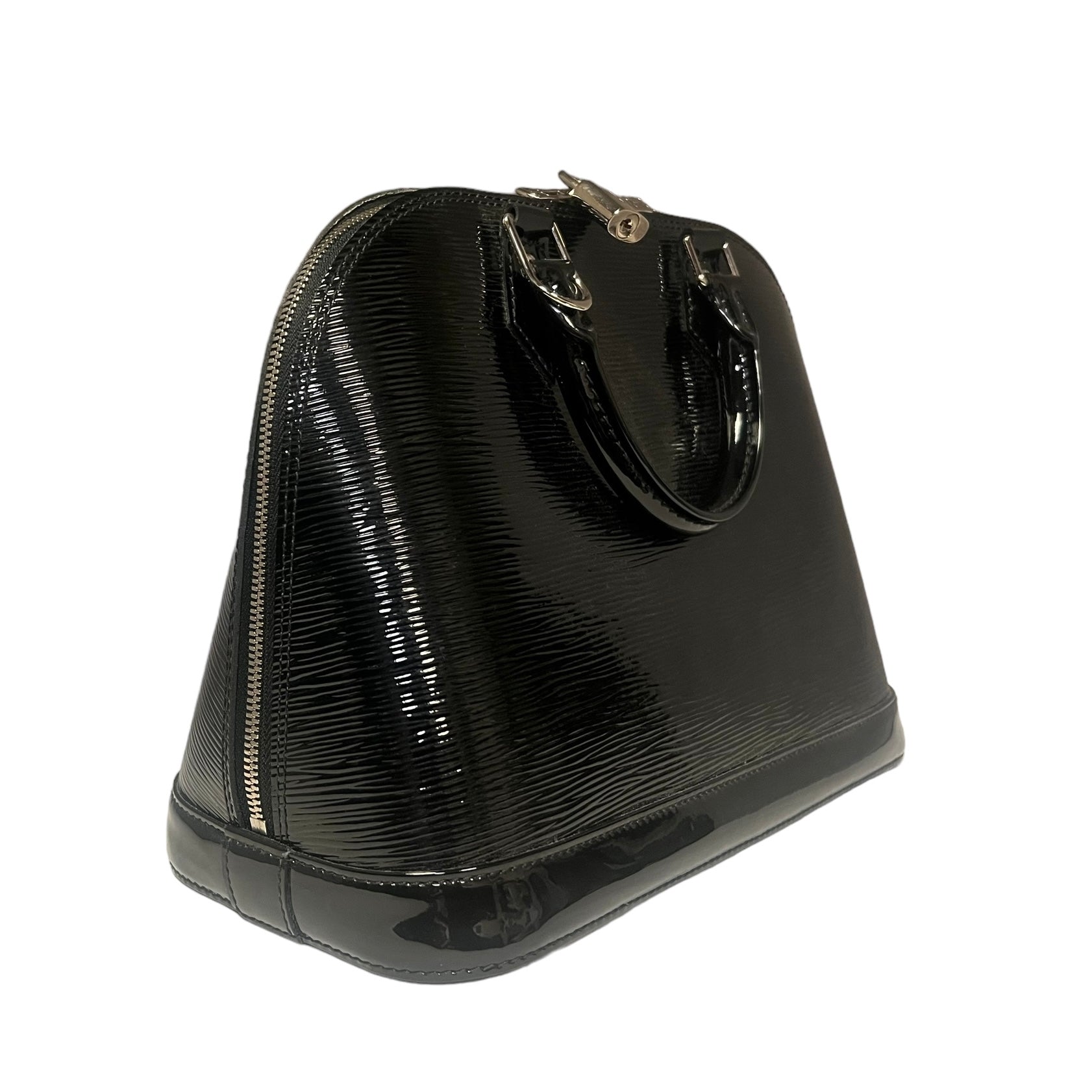 This is an authentic LOUIS VUITTON Alma PM crafted in black, high gloss "Electric" Epi Leather embossed with the LV logo features two rolled top handles, polished silver tone hardware, zipper closure with padlock, detachable key clochette, gray microfiber interior lining, two interior flat pockets and four base studs.