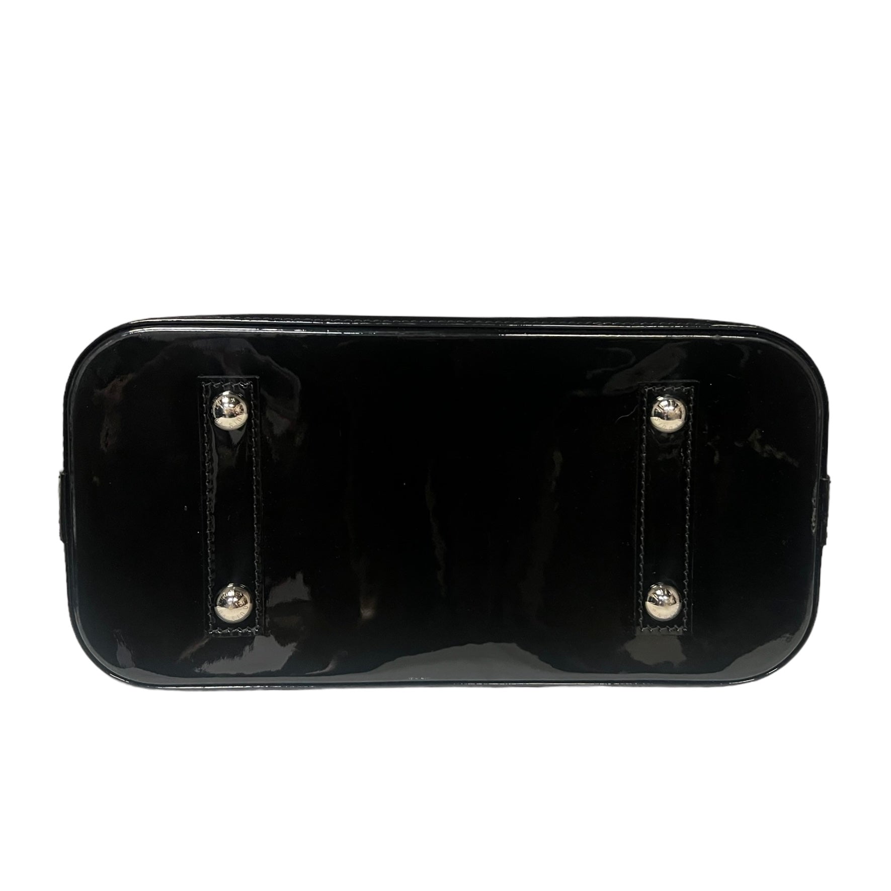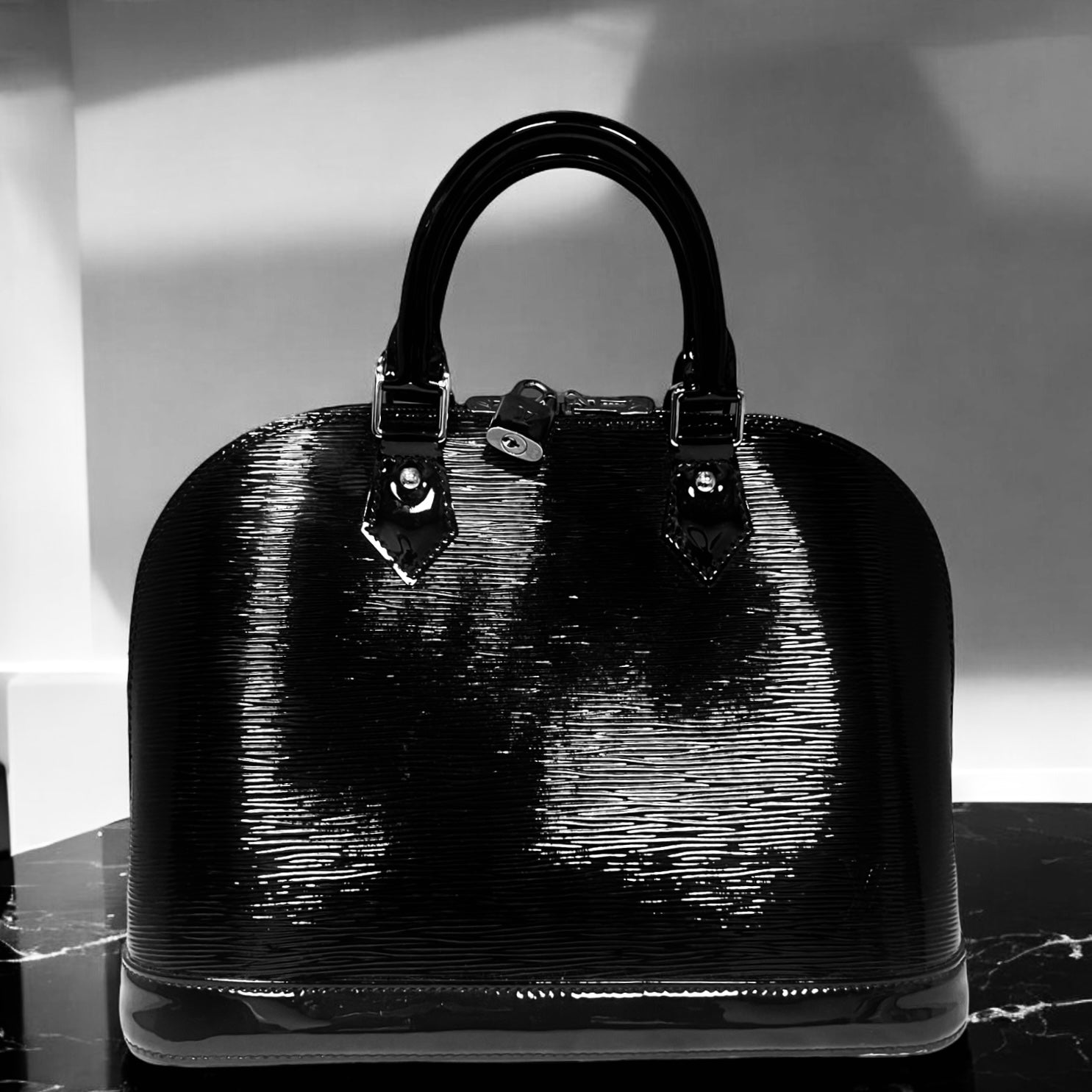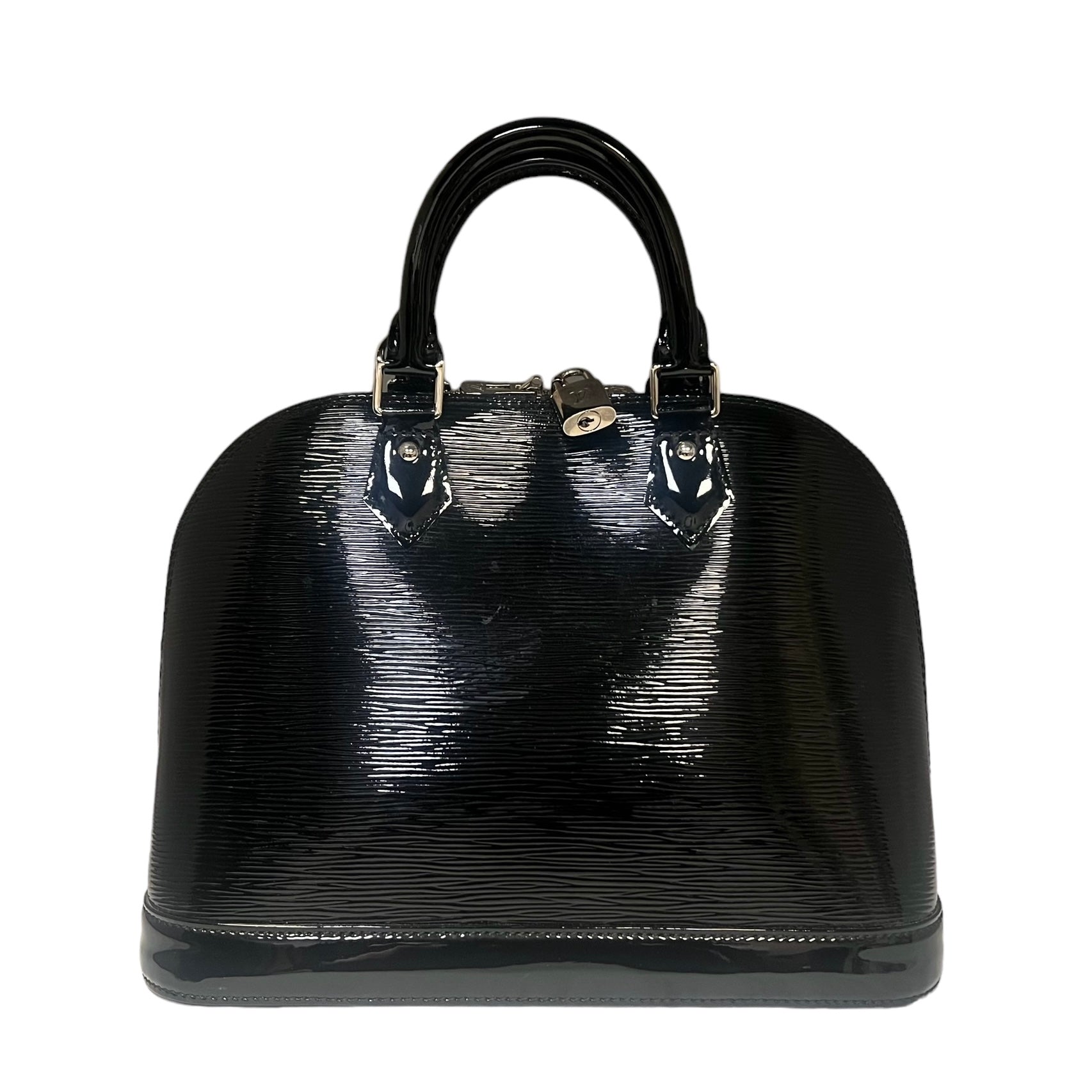 This is an authentic LOUIS VUITTON Alma PM crafted in black, high gloss "Electric" Epi Leather embossed with the LV logo features two rolled top handles, polished silver tone hardware, zipper closure with padlock, detachable key clochette, gray microfiber interior lining, two interior flat pockets and four base studs.