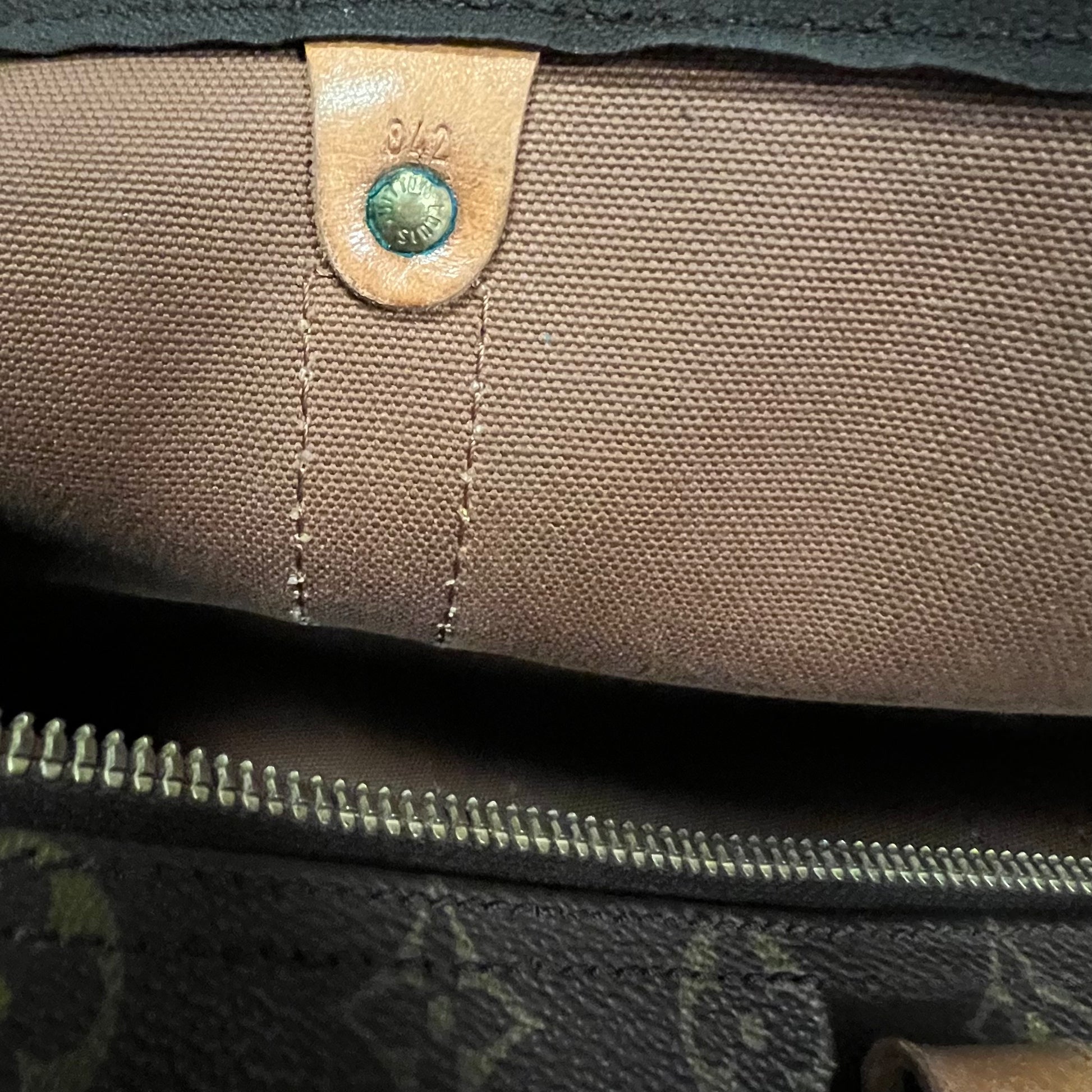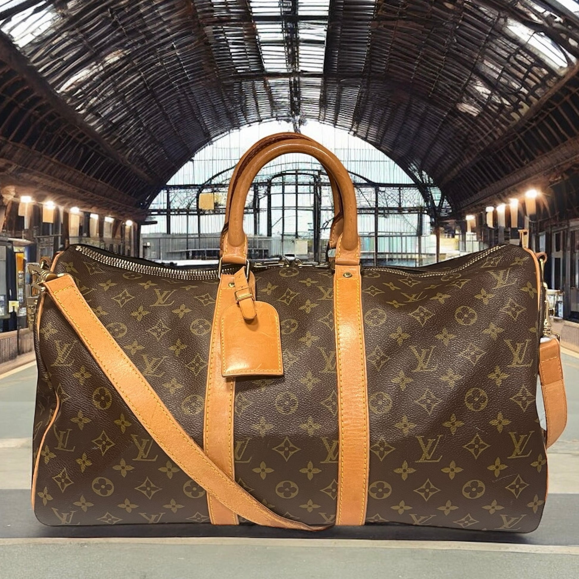 This authentic LOUIS VUITTON Keepall Bandouliere 45 in Monogram Canvas Leather and cowhide trim features gold tone hardware, a removable leather name tag, cotton textile interior lining, two handles, and a removable, adjustable strap.