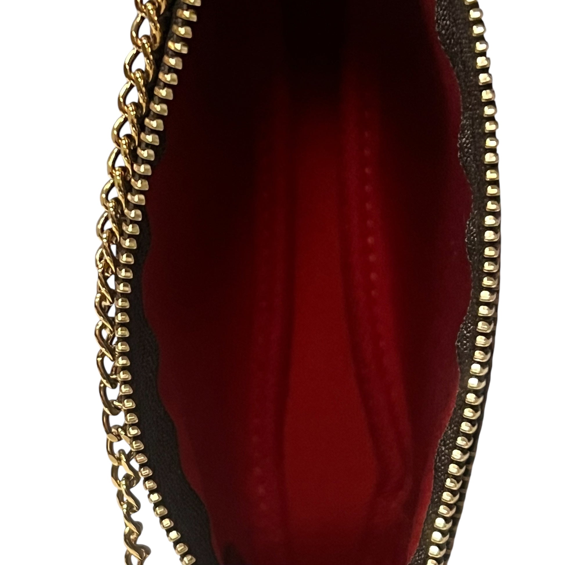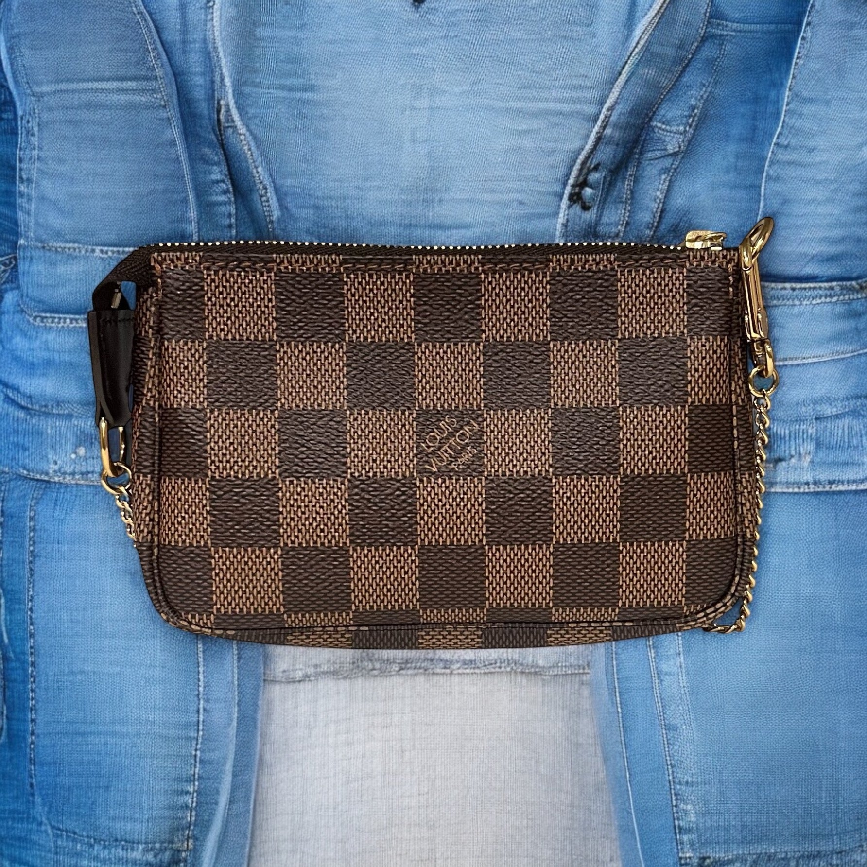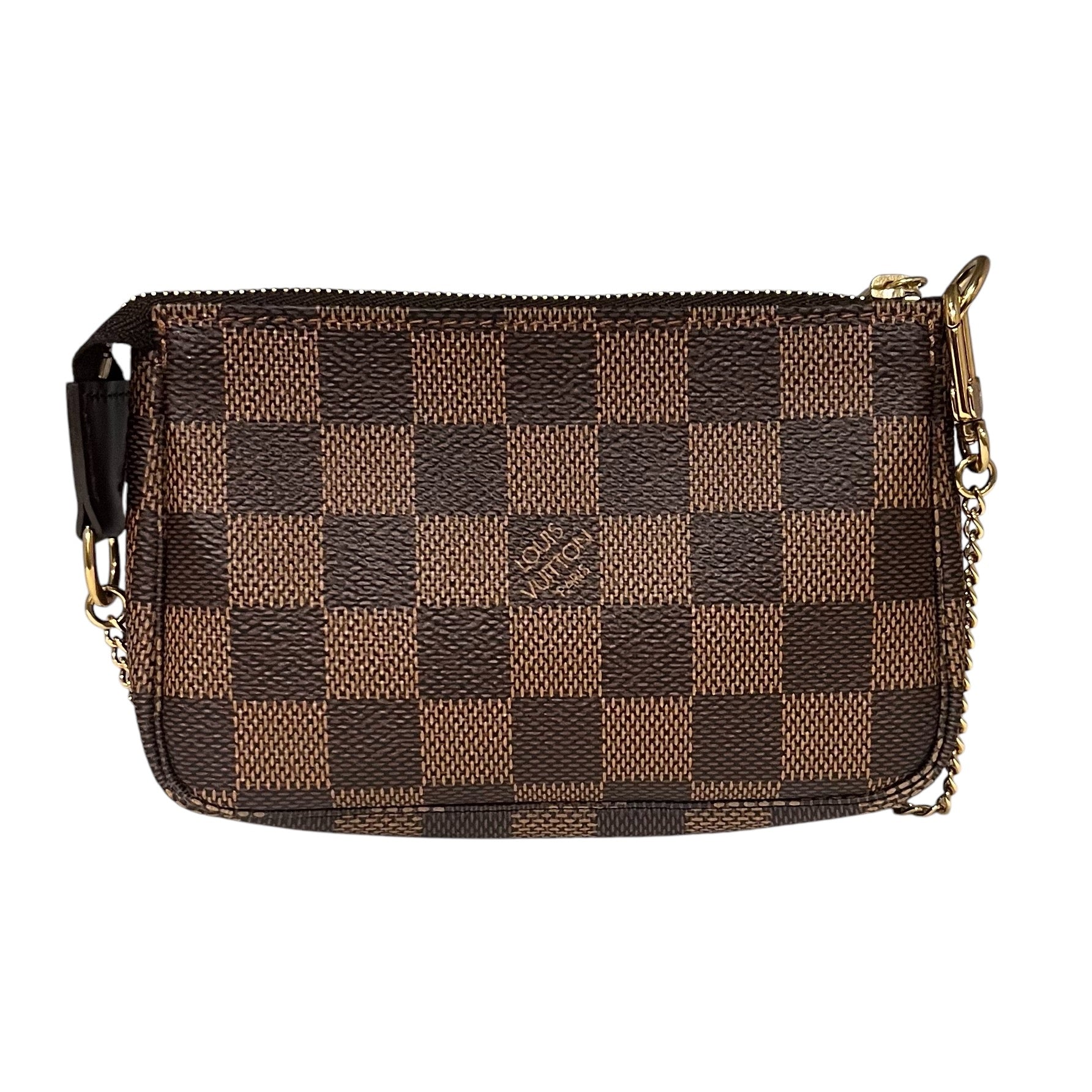 This authentic LOUIS VUITTON Mini Pochette Accessoires in Damier Ebene coated canvas with dark brown leather features gold tone hardware, zipper closure, red textile lining, and a chain handle with hook that can be converted into a wristlet, so it can be carried as a handbag, clutch or wristlet.