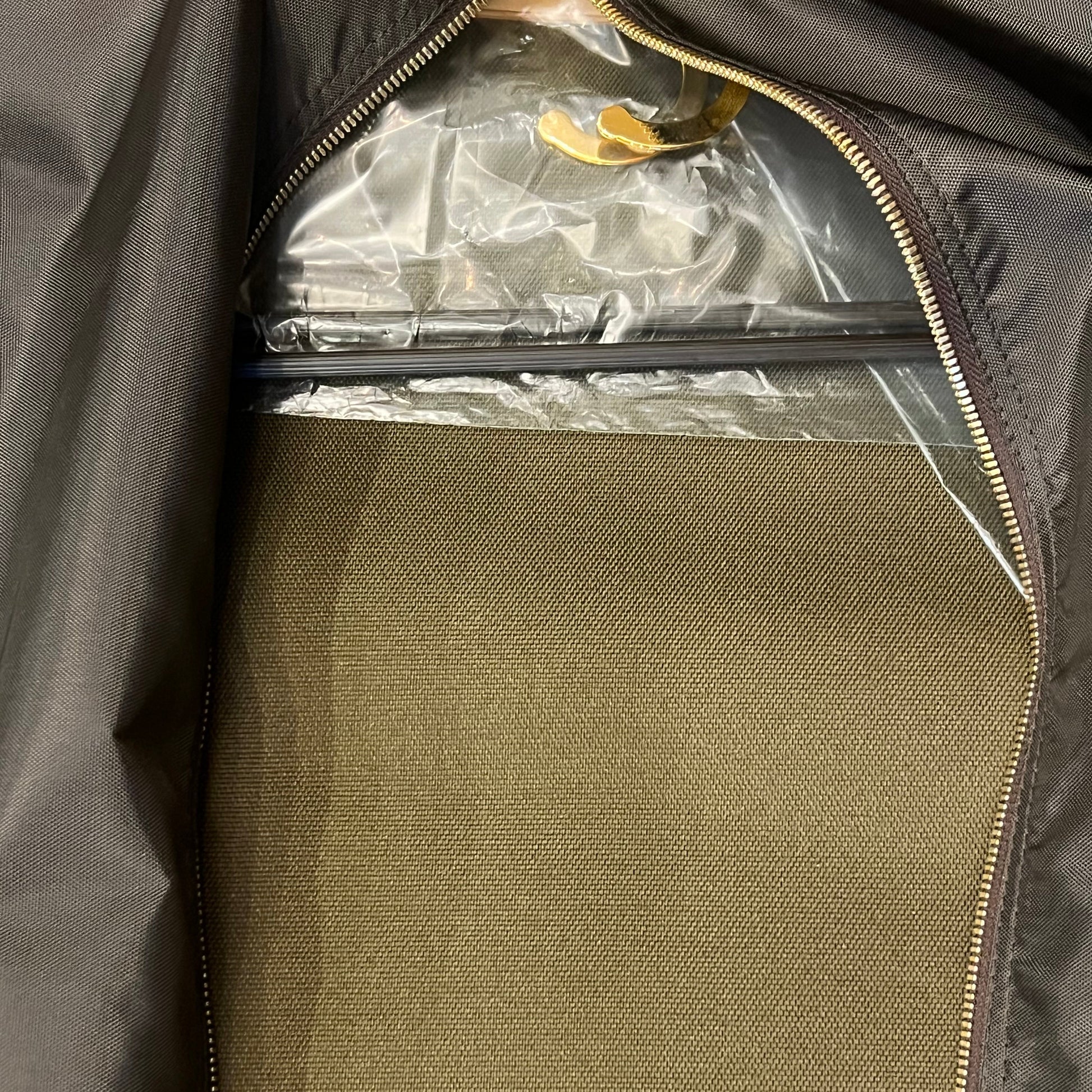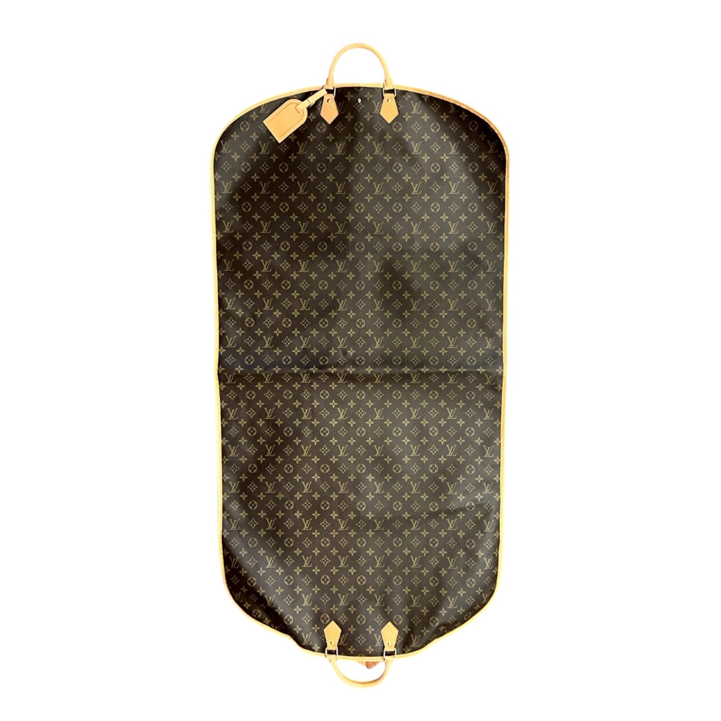This authentic LOUIS VUITTON Monogram Garment Cover features brown monogramed coated canvas, Vachetta cowhide leather trim, gold toned hardware, two rolled leather top handles, a hook at the top, 2 interior hangers, a single zipper compartment with lock and key, and button closure.