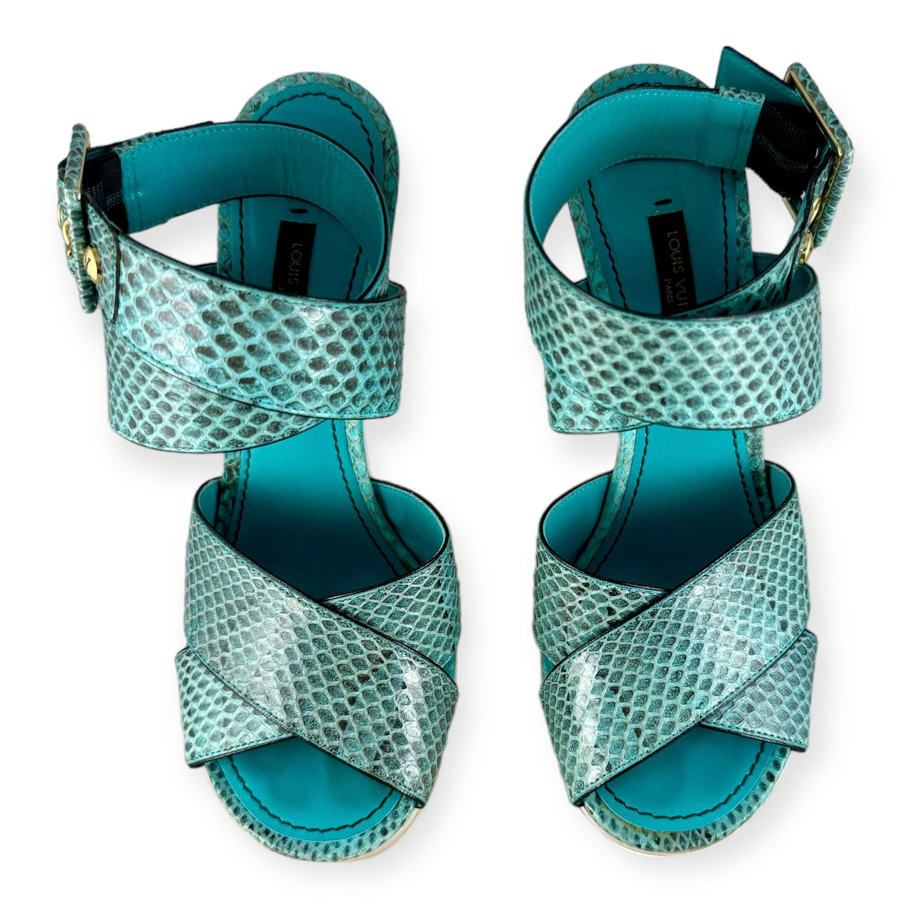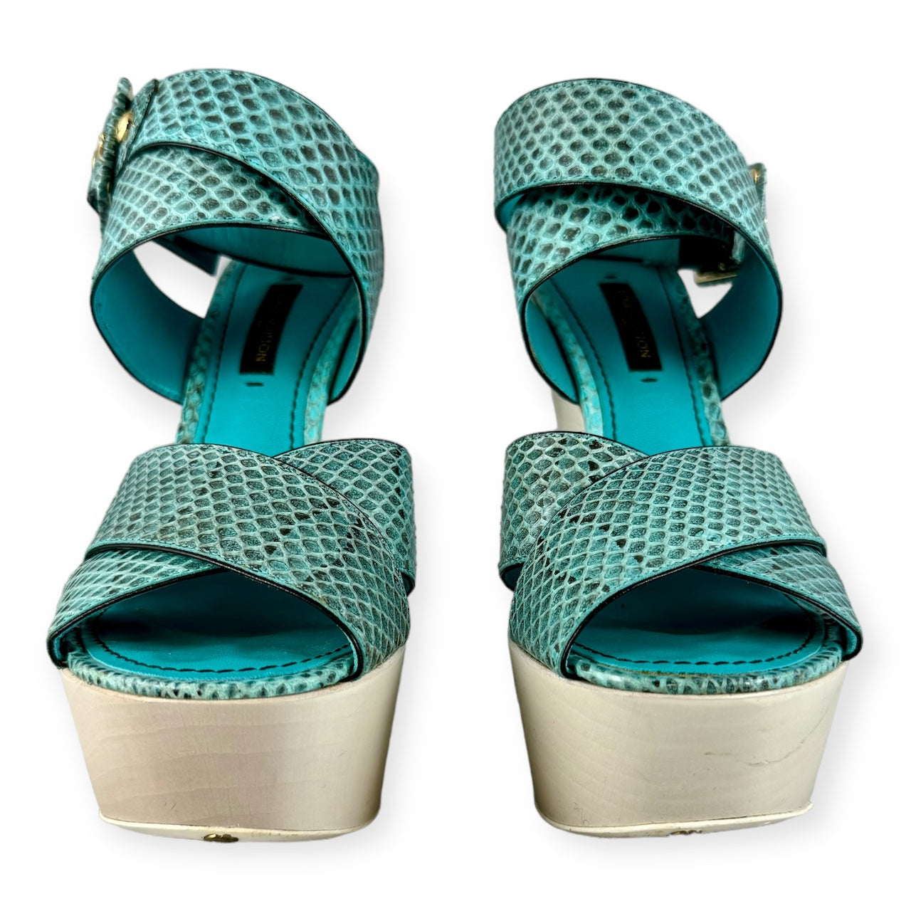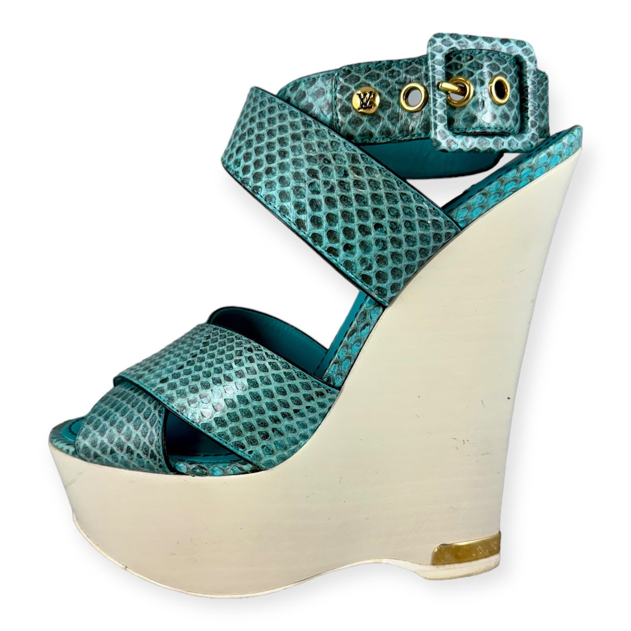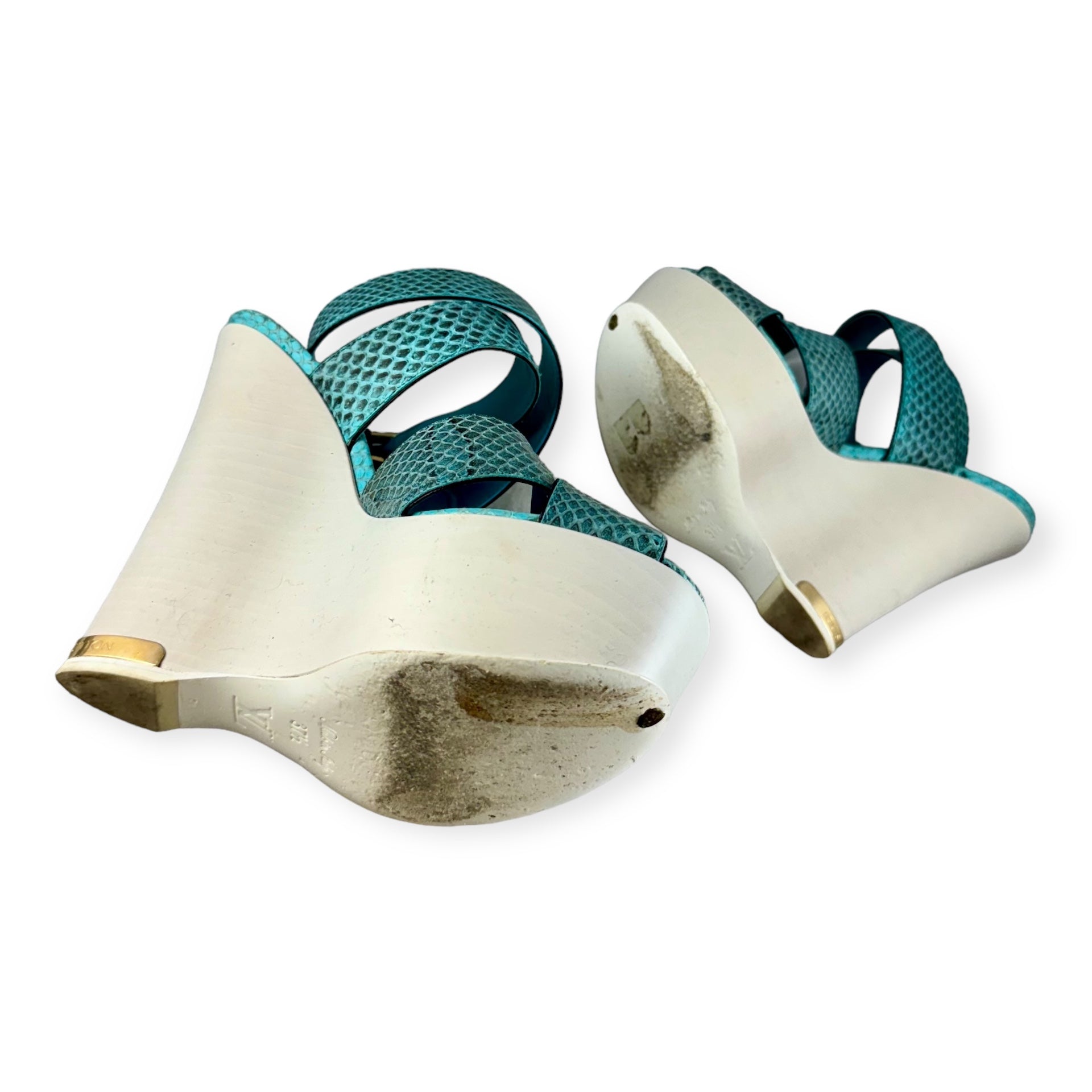 LOUIS VUITTON Snake Wedge Sandals in Turquoise | Size 37.5