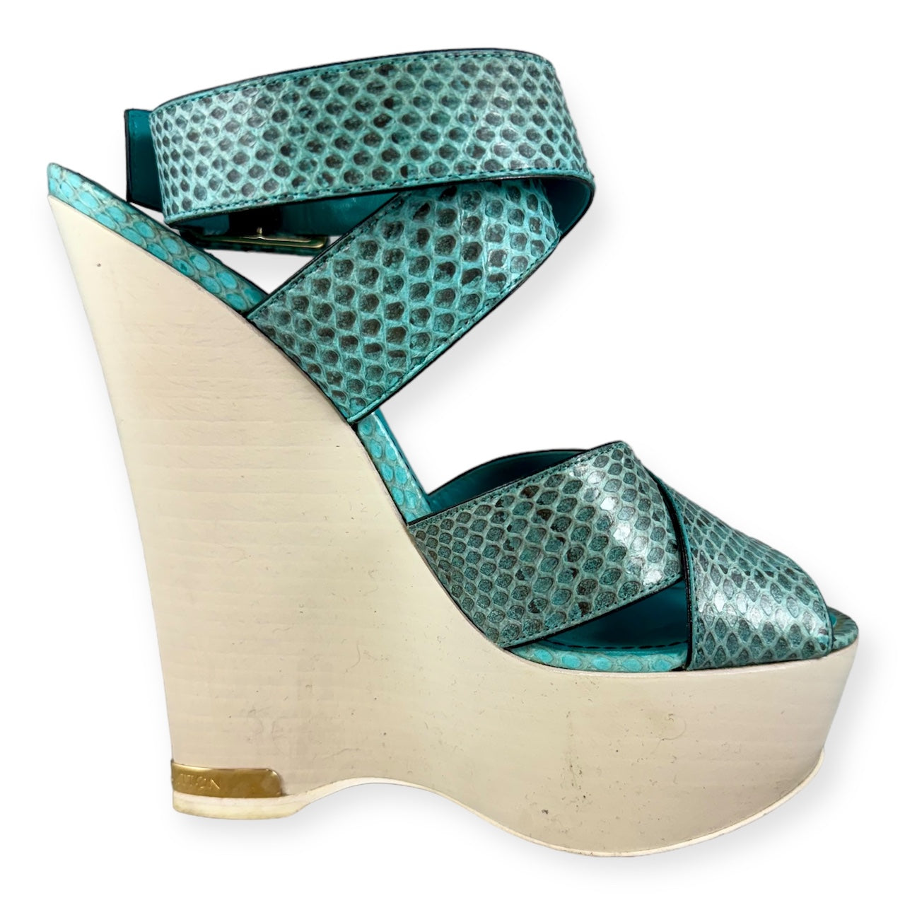 This is an authentic pair of LOUIS VUITTON Snake Wedge Sandals in Turquoise. These fabulous wedges are crafted of snake-embossed leather with gold-toned hardware. They feature a round toe, an upper crisscross strap, a 1.75 inch platform, a 5 inch heel, and a crisscross ankle strap with an adjustable buckle closure.