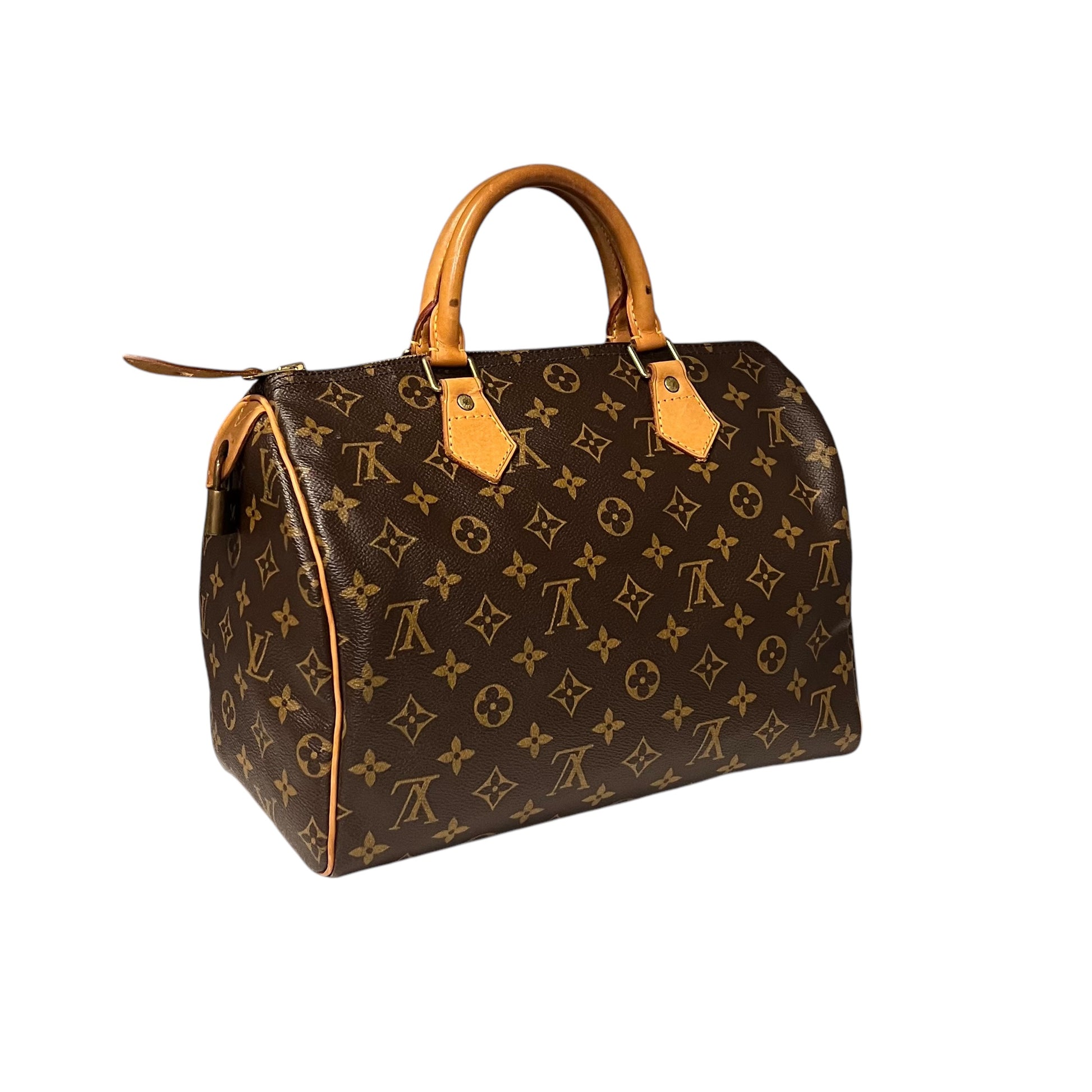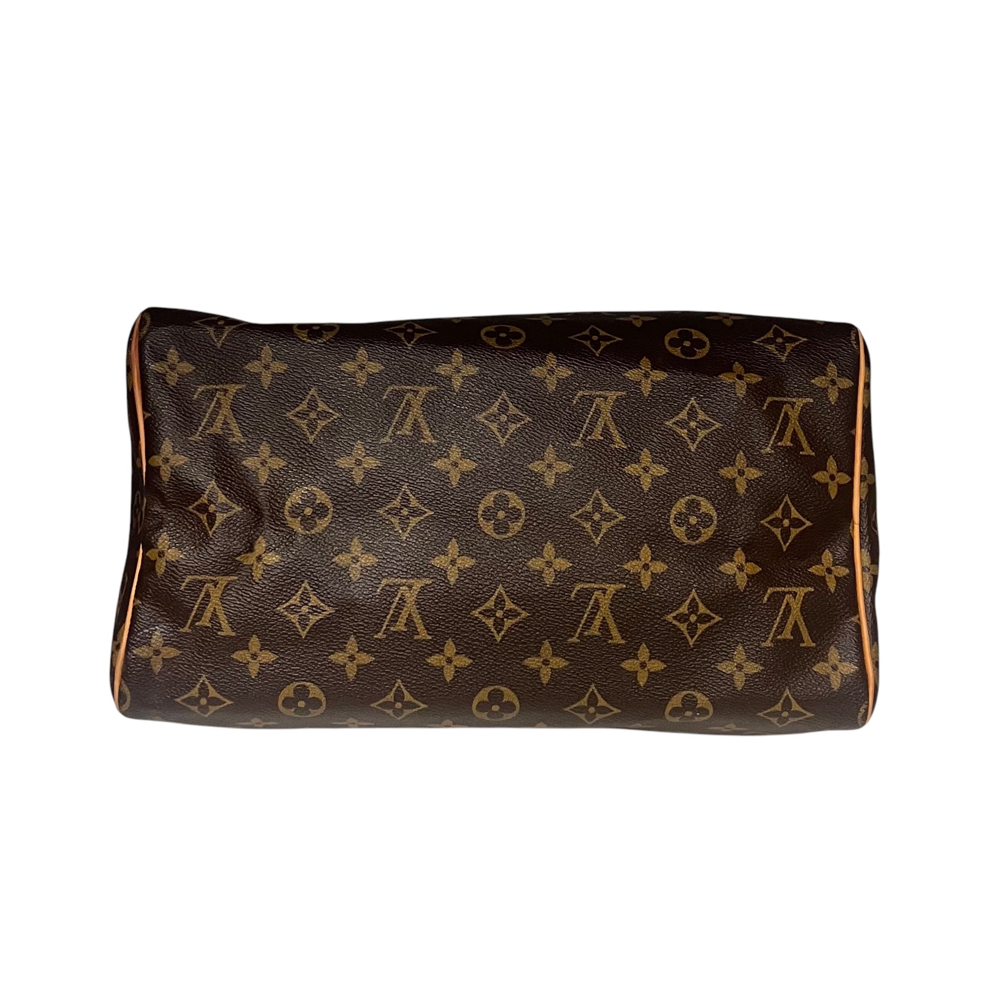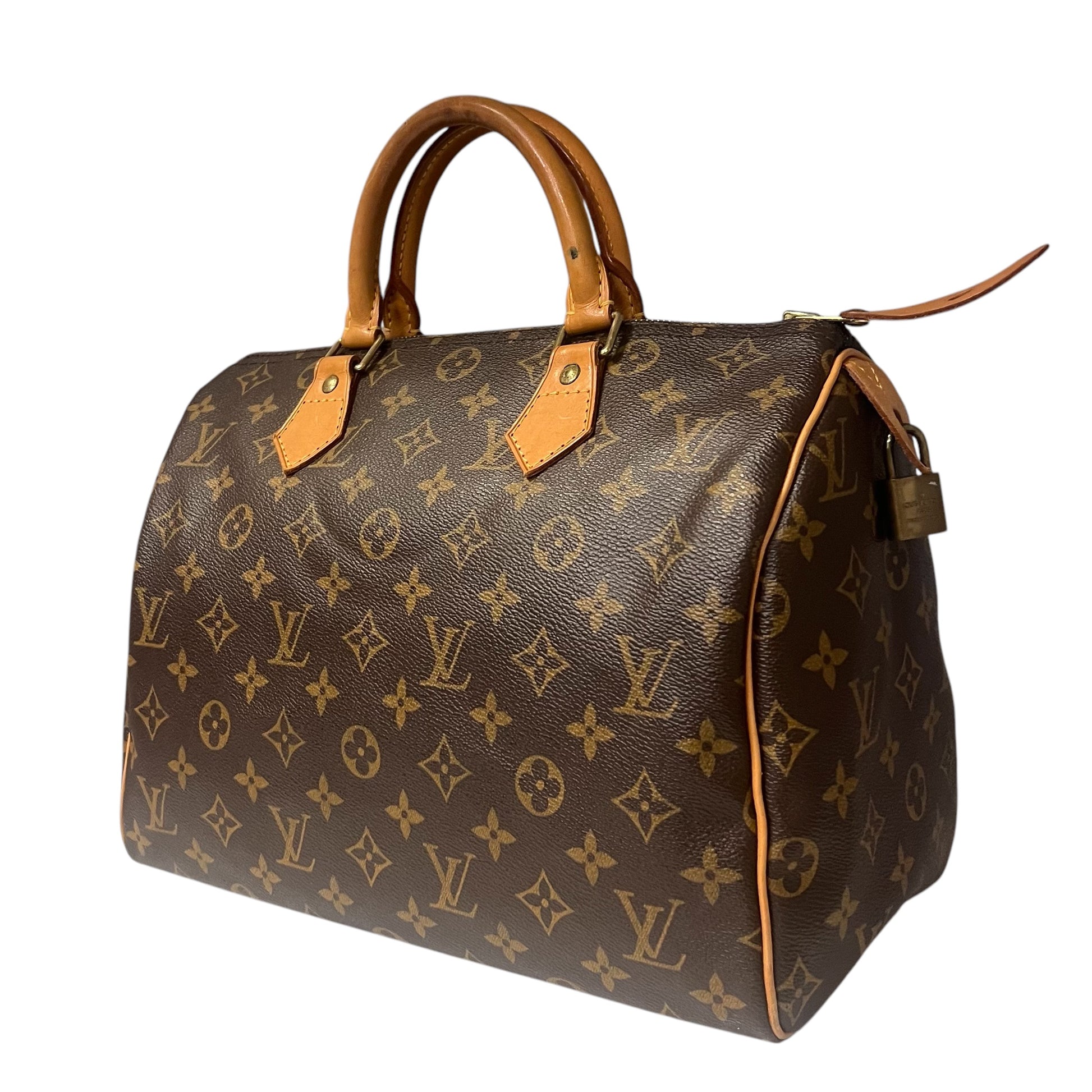 This authentic LOUIS VUITTON Speedy 30 in Monogram coated canvas with gold tone hardware and natural cowhide leather features a zipper closure, two top handles, brown fabric interior lining, one interior pocket, and a padlock.