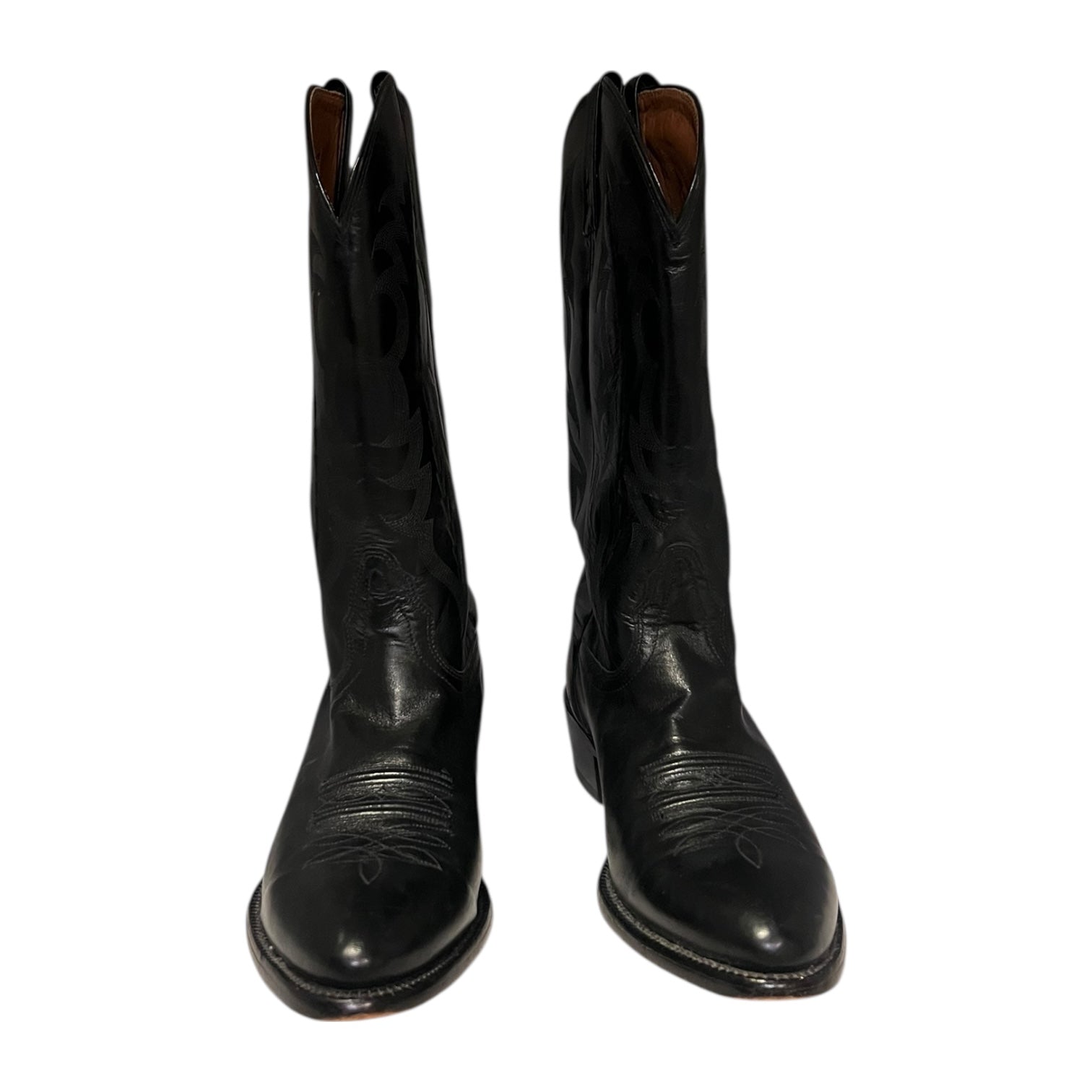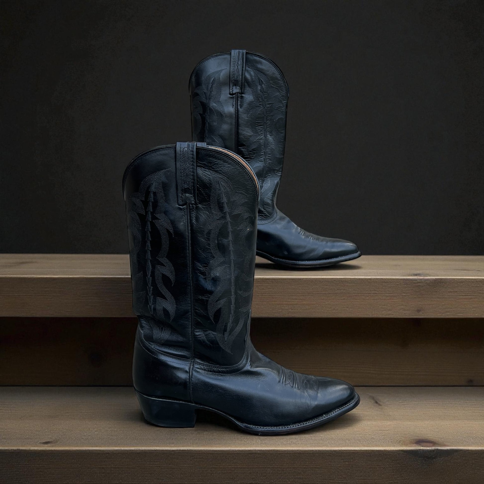 This is an authentic pair of LUCCHESE Cowboy boots in black leatherfeature sharp stitch designs on the calf skin shaft, a leather sole, and an almond toe.