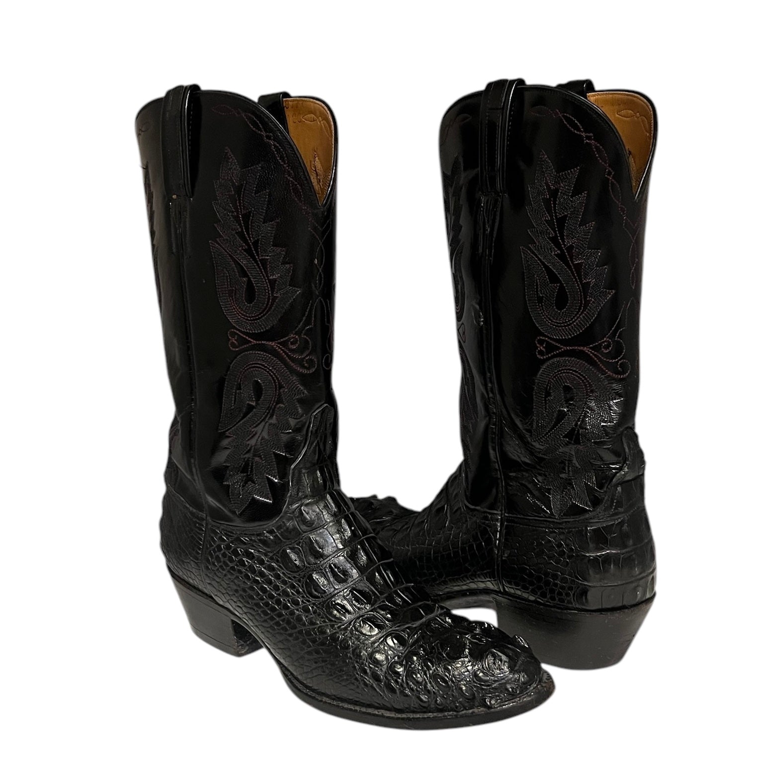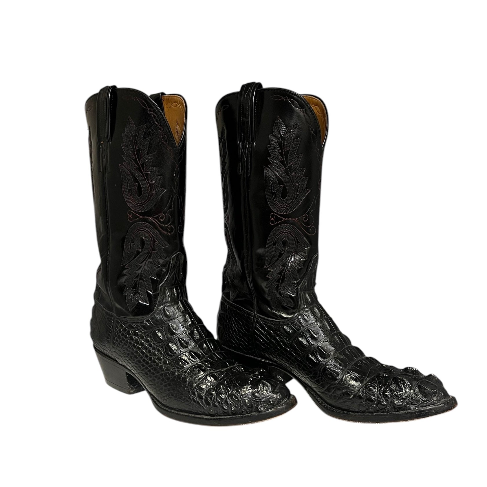 This is an authentic pair of LUCCHESE Hornback Caiman Cowboy boots in black. These beautiful cherry black boots feature sharp stitch designs on the calfskin shaft, a hornback caiman tail vamp, leather sole, and a square toe.