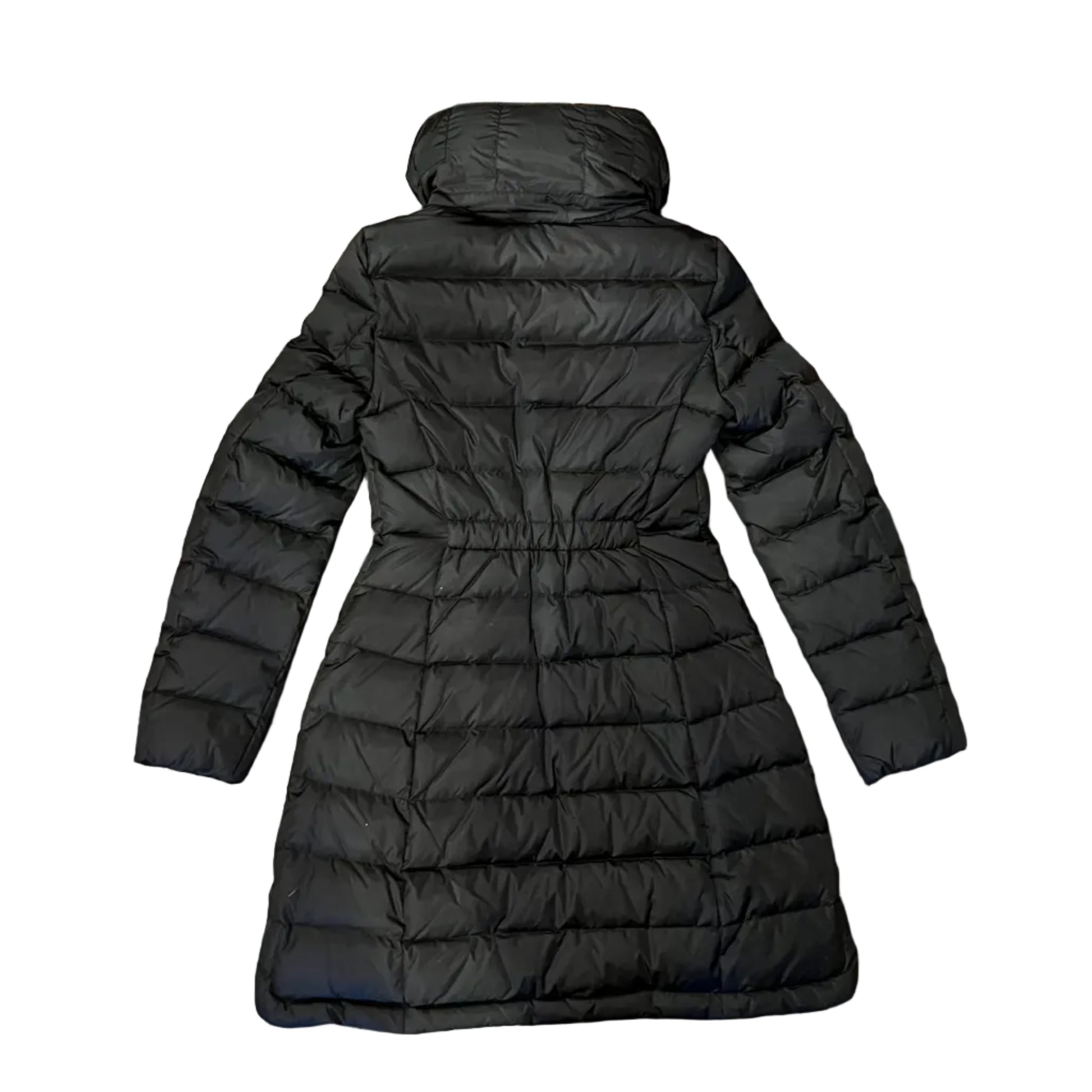 This is an authentic MONCLER Puffer Coat in Black featuring two pockets, zipper and button closure, and a Moncler patch on the sleeve.