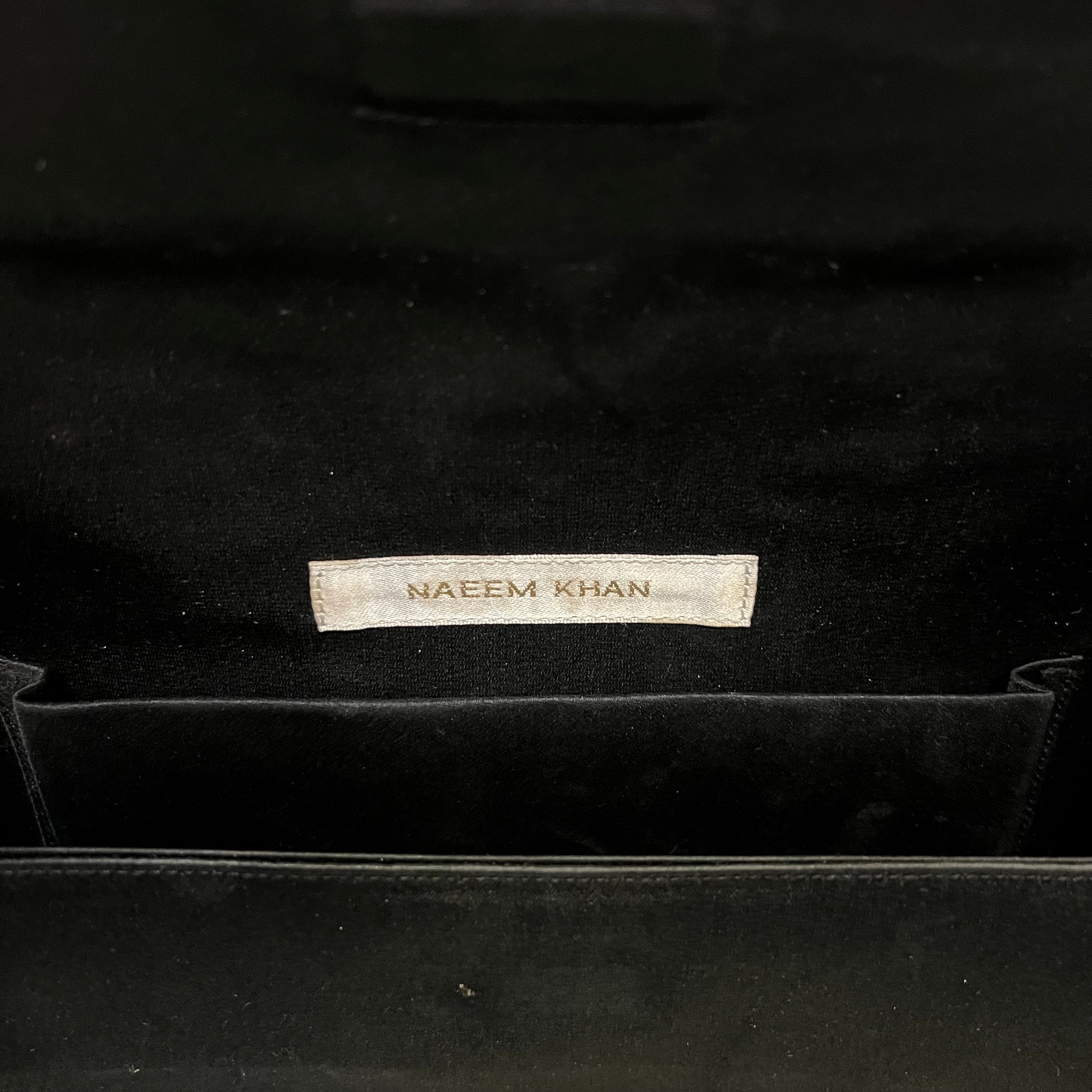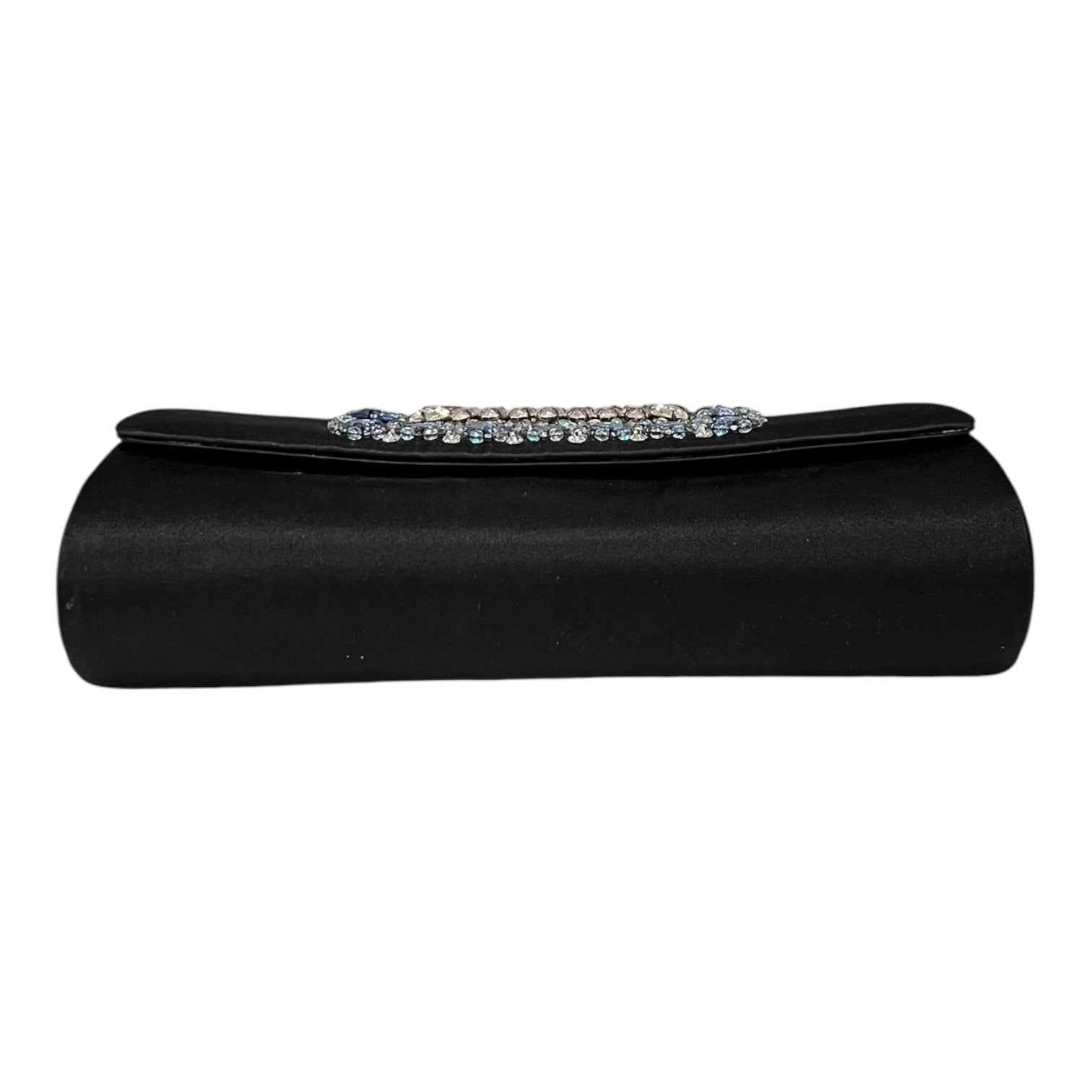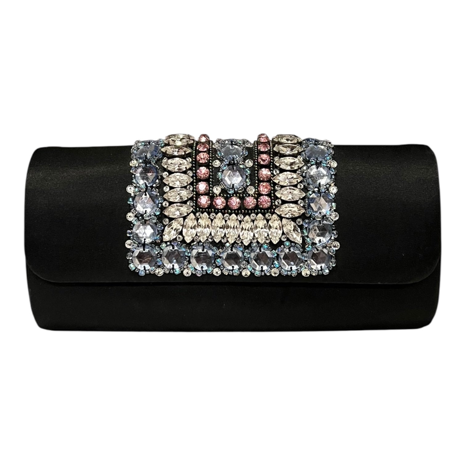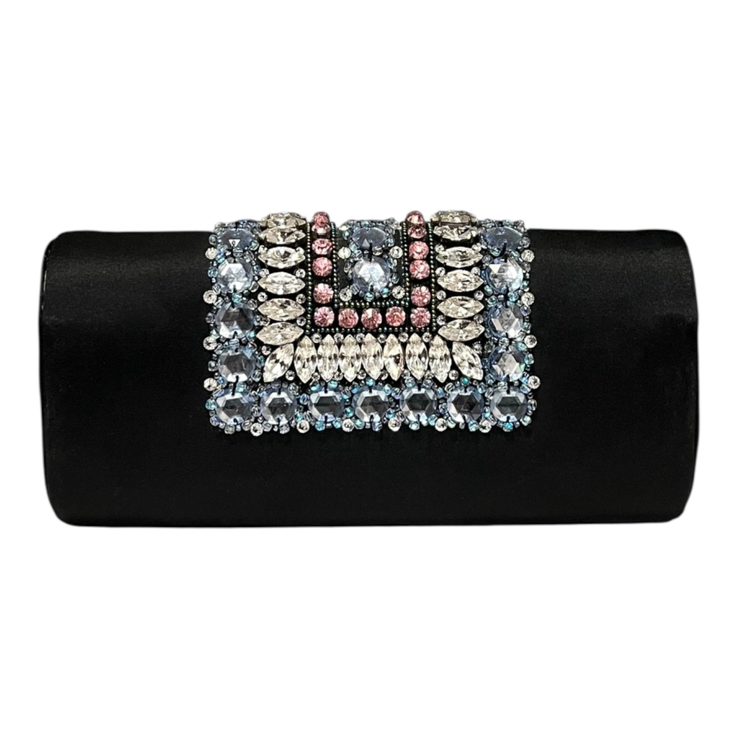This is an authentic NAEEM KHAN Jewel Embellished Evening Bag featuring a sleek black body with fold-over an magnetic closure, embellished with pink and blue jewels.