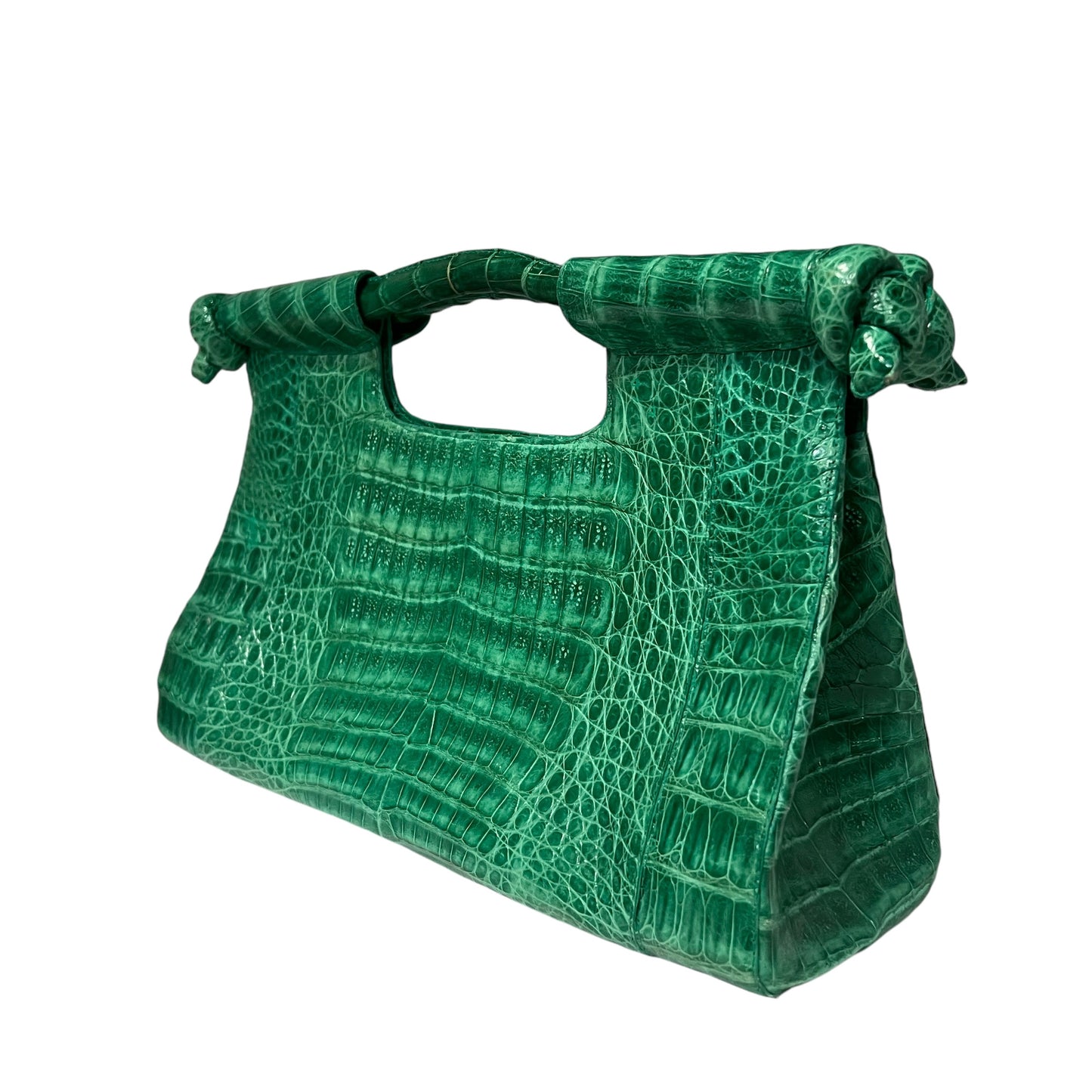 The Nancy Gonzalez Top Handle Bag is a luxurious and striking accessory crafted from green crocodile leather, making it a standout piece for any wardrobe. With its bold animal print design and gold-tone hardware, this bag effortlessly combines elegance and exotic flair. It features sleek cutout handles for a contemporary edge and has a snap closure at the top to secure your belongings.
