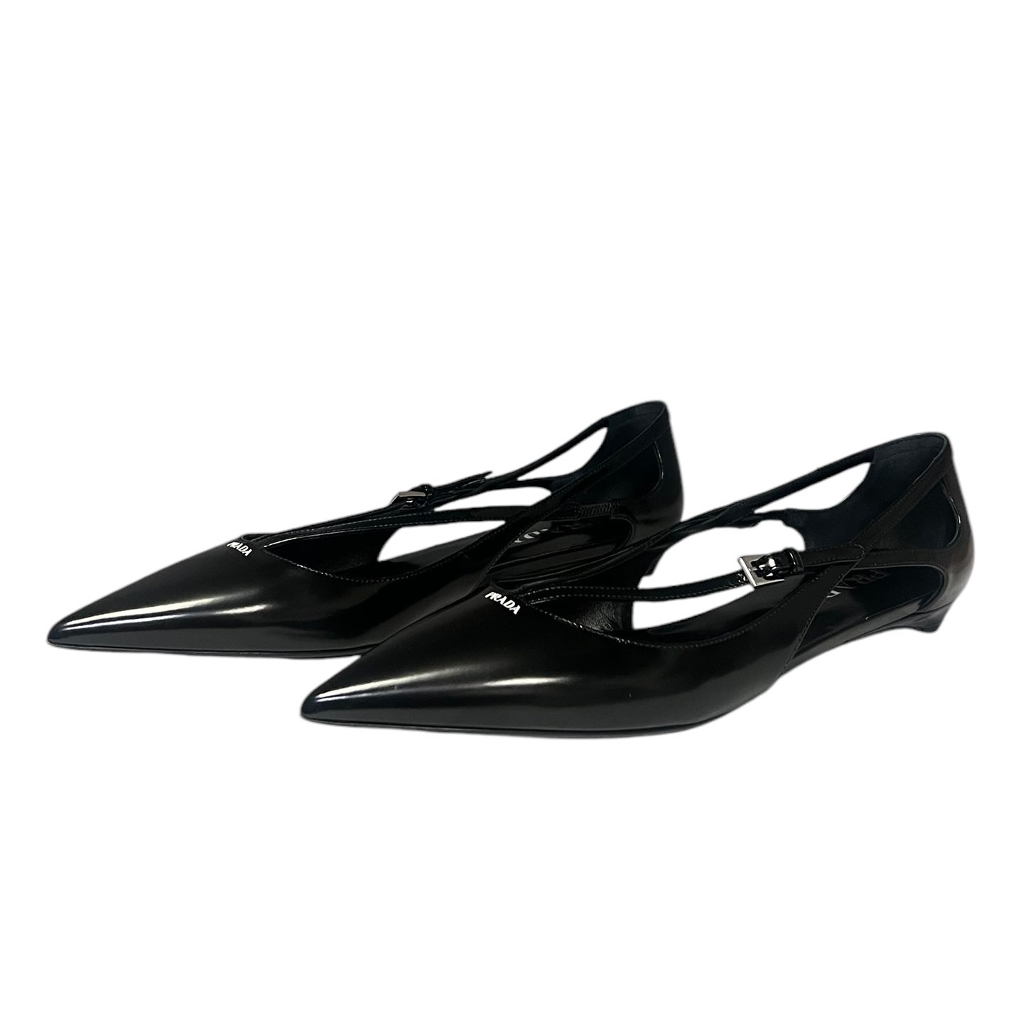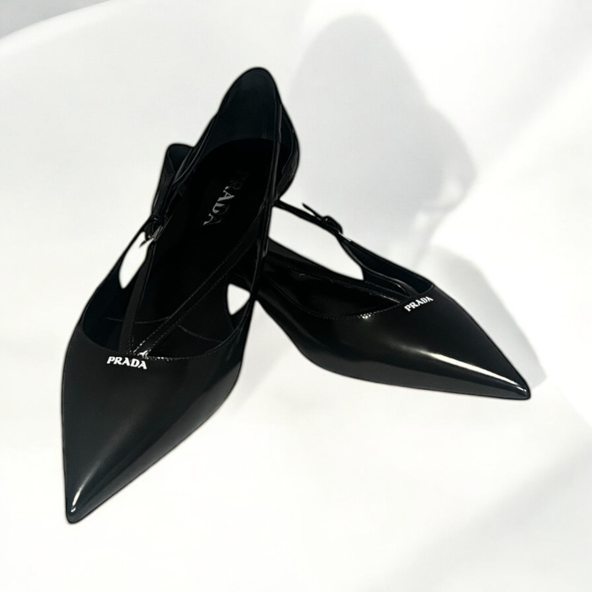 These are authentic PRADA Strappy Kitten Heels in the color black and in the size 40. They are crafted of black polished leather with a pointed toe, crossing straps, and an adjustable buckle.