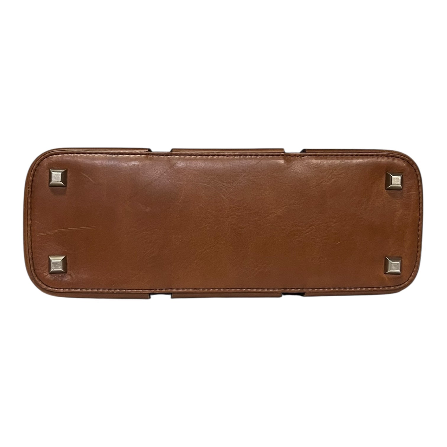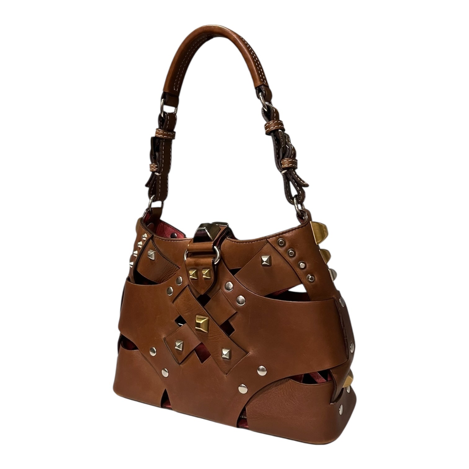 This PRADA Studded Shoulder Bag in brown leather with antiqued gold and silver toned hardware features one buckle shoulder strap, a studded tab snap closure, stud embellishments throughout, pink leather interior lining, one interior zipper pochette in pink leather, and four base studs.