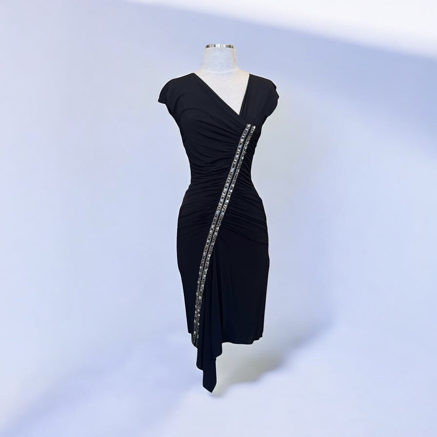 This authentic ROBERTO CAVALLI Crystal Embellished Jersey Dress features a classic silhouette in black with ruching embellished with crystals, a V neckline and cap sleeves.