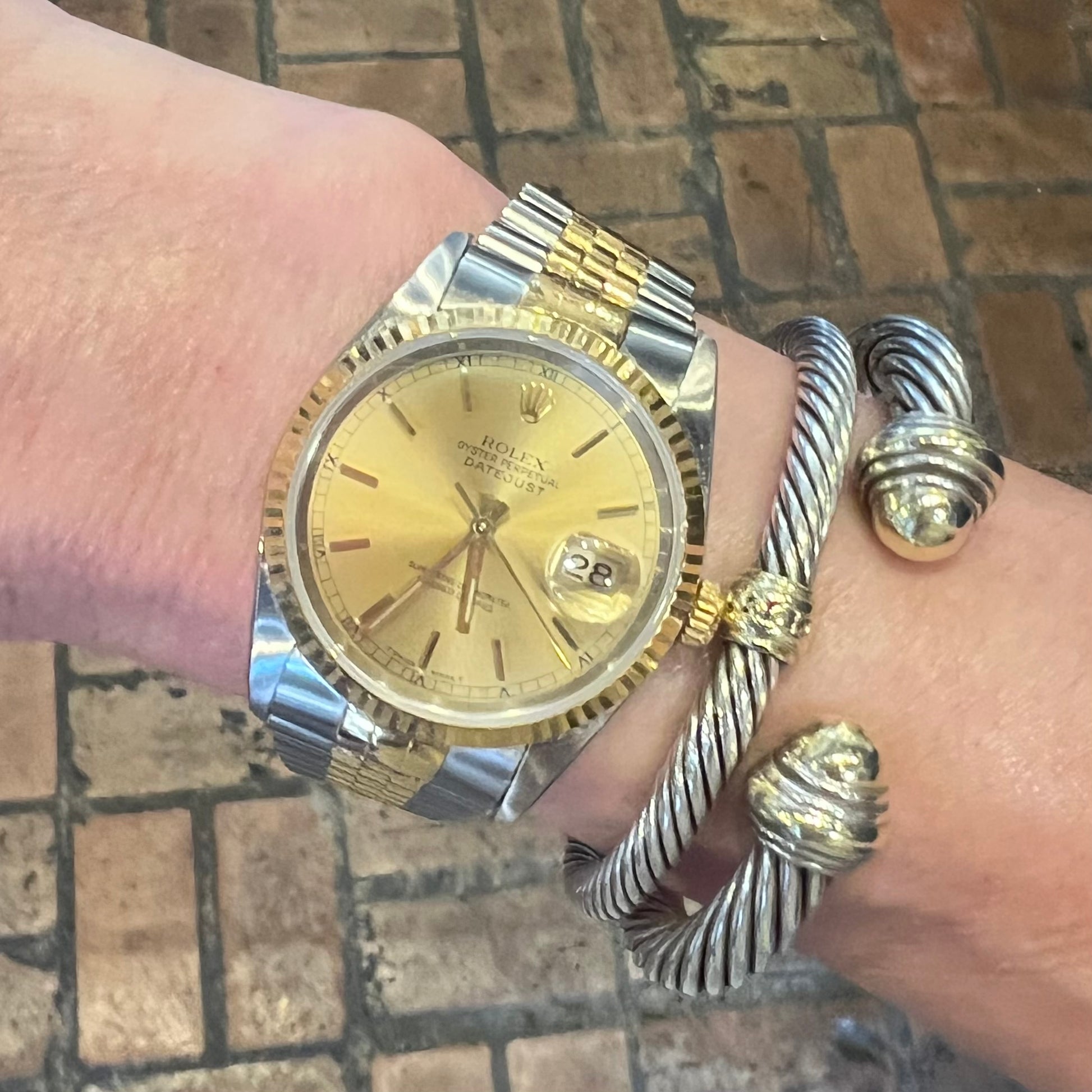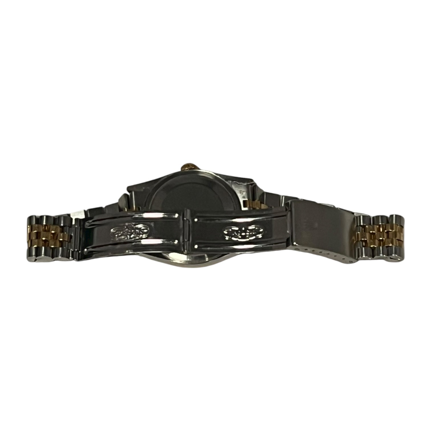 This authentic ROLEX Gents Oyster Perpetual DateJust Watch in Stainless Steel and 18K Yellow Gold, features an 18K yellow gold Fluted Bezel, Automatic Movement, Quickset Date Function, Sapphire Crystal, Champagne tone dial with Stick Hour Markers and Roman Numeral Track with Luminescent Hands, and a Stainless Steel and 18K Yellow Gold Jubilee Bracelet.
