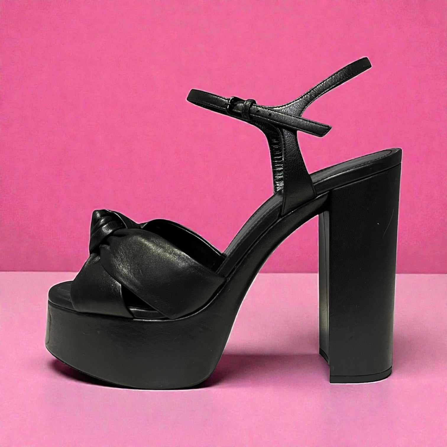 This is an authentic pair of SAINT LAURENT Bianca Platform Sandals in black featuring two crisscrossed straps with a knot, an adjustable strap with buckle closure, black lambskin leather, a round open toe, and a 5 inch block heel.