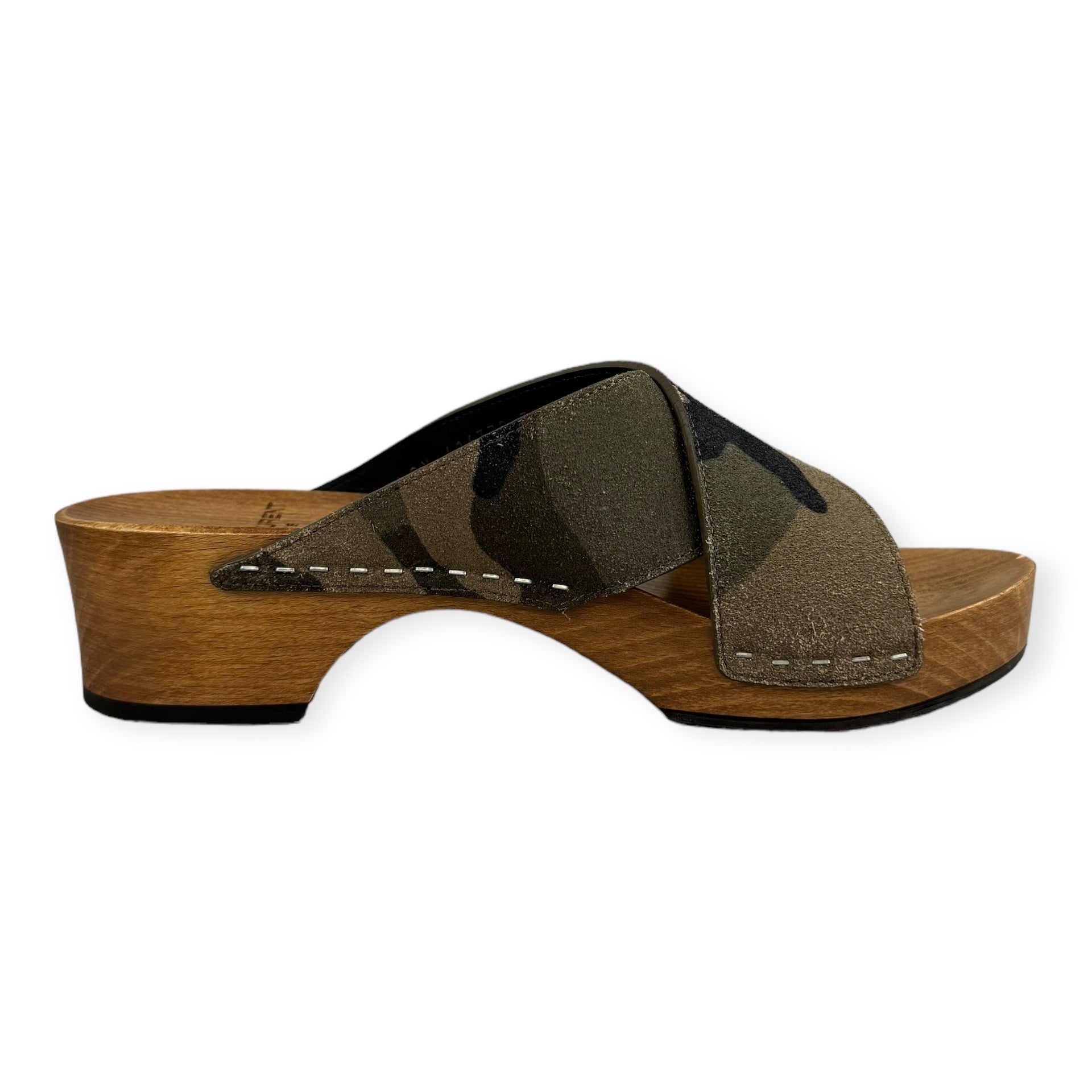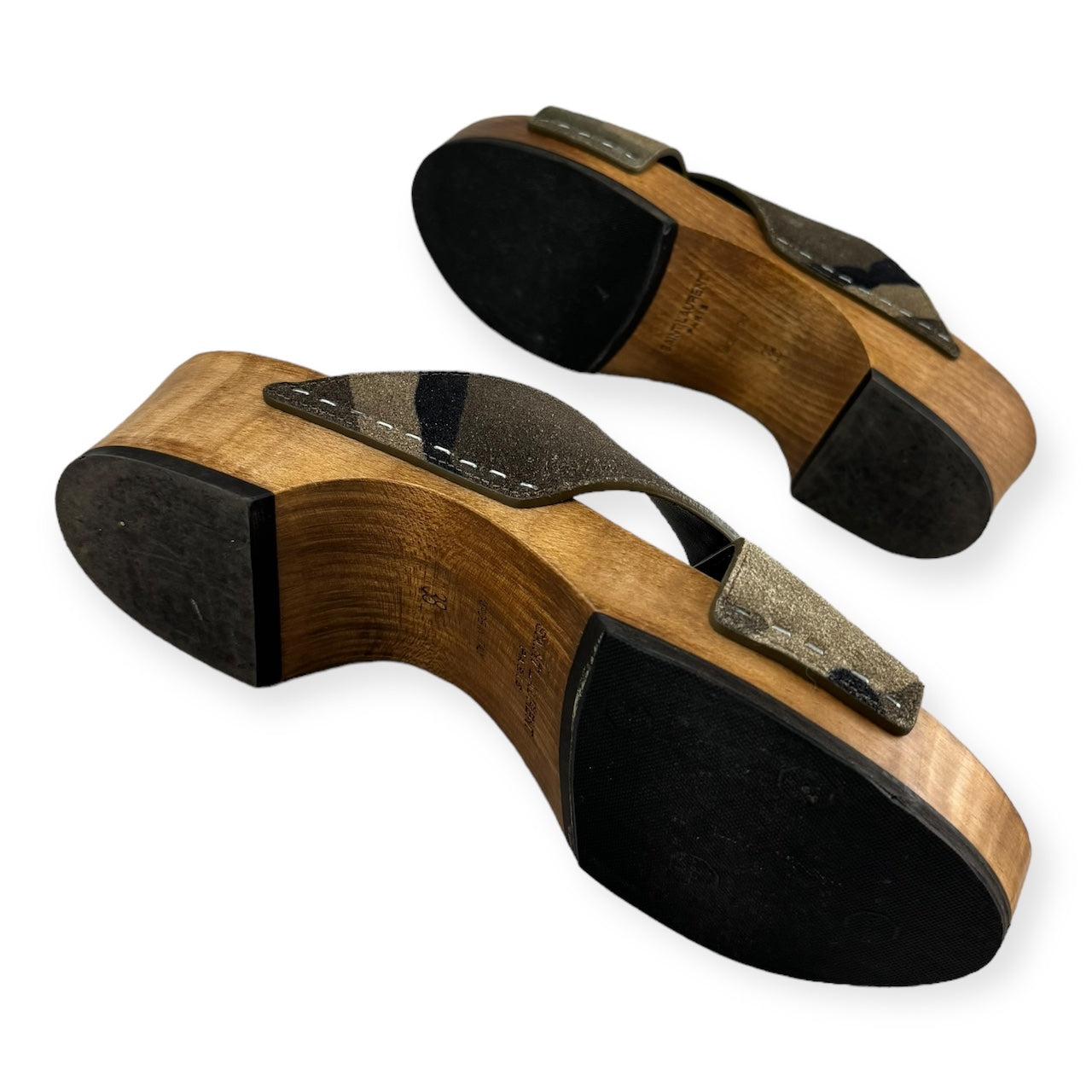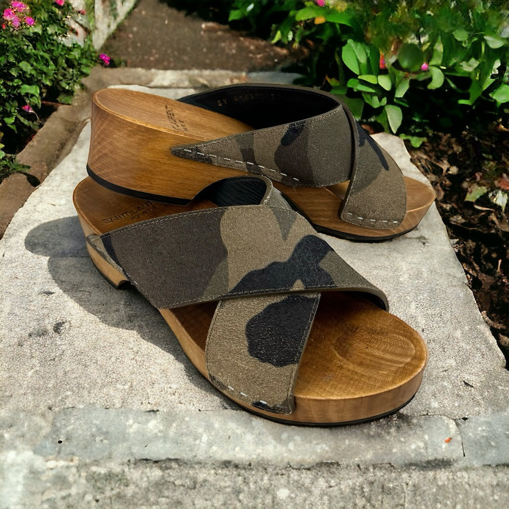 This is an authentic pair of SAINT LAURENT Camo Slide Sandals in Green. These stylish sandals are crafted of camo fabric with leather lining and chunk wooden platforms.
