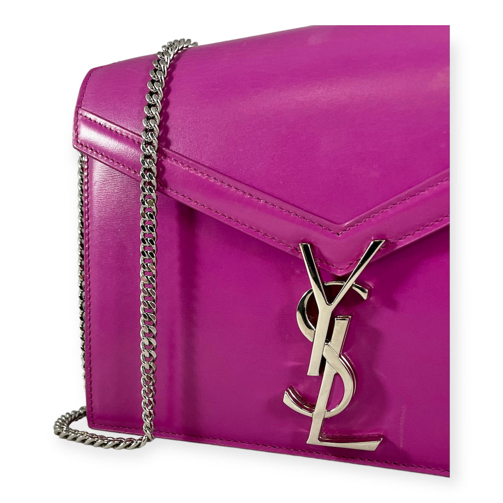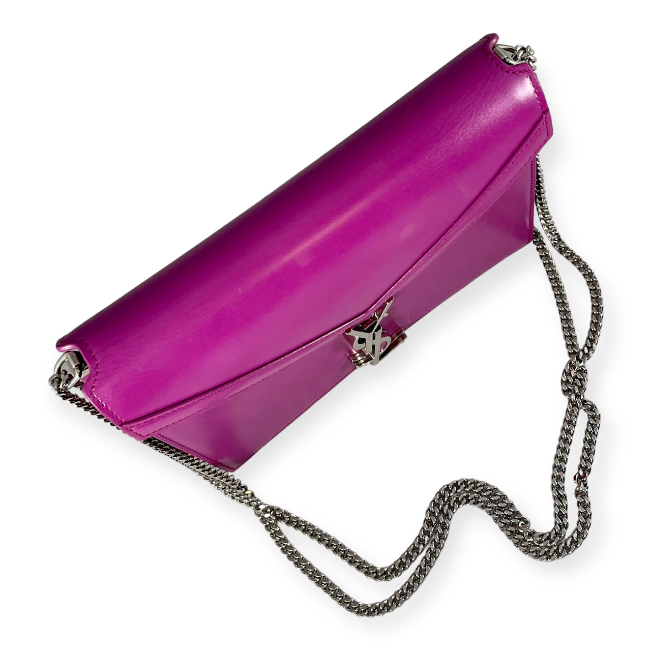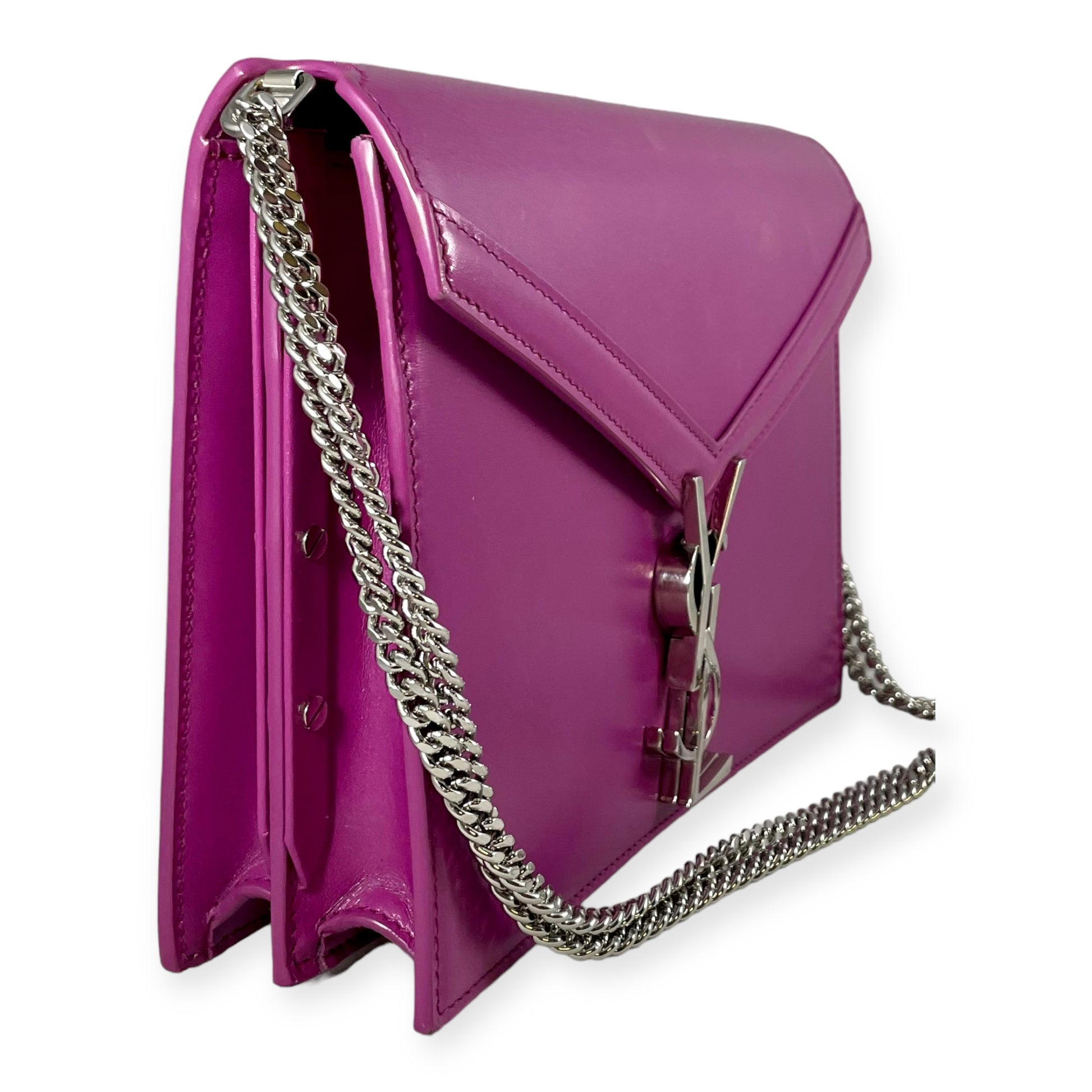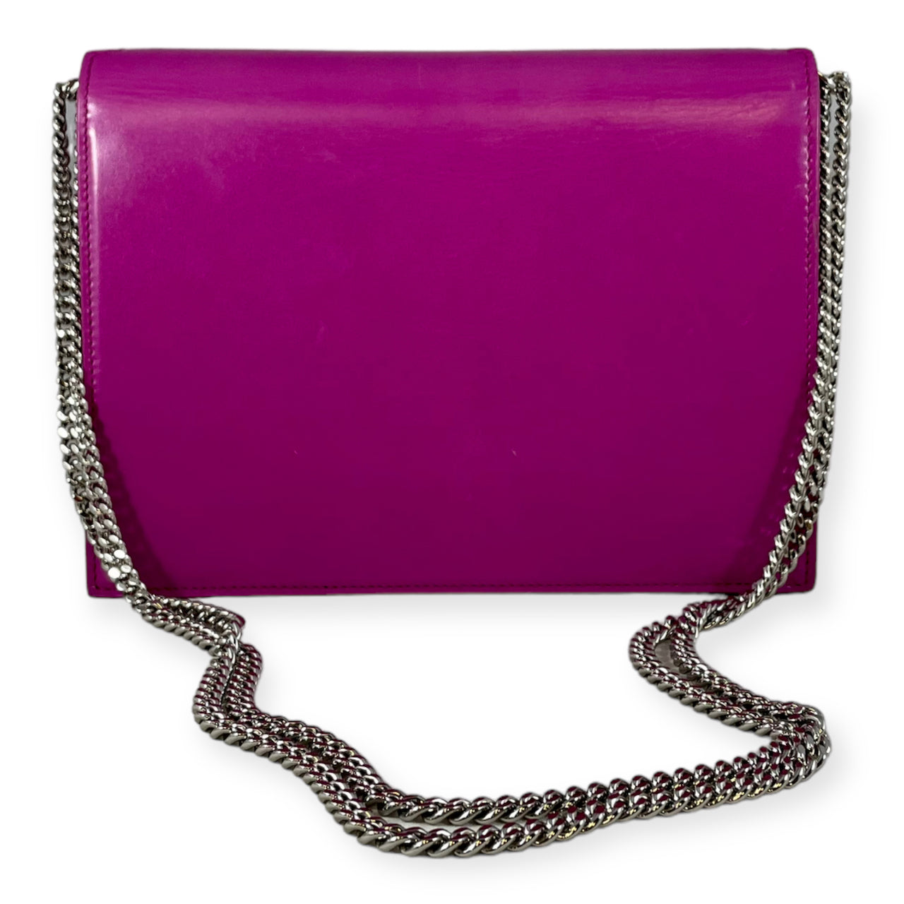 This is an authentic SAINT LAURENT Cassandra Bag in Fuchsia. This stunning bag is crafted of luxurious leather with silver-toned hardware. It features a chain-link shoulder/crossbody strap, a front envelope flap with the iconic YSL lock closure, and a partitioned black leather interior with one zipper pocket and one patch pocket.