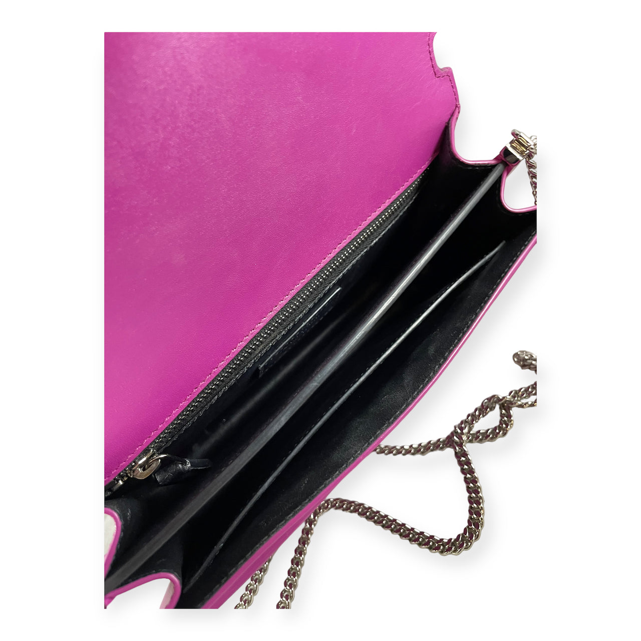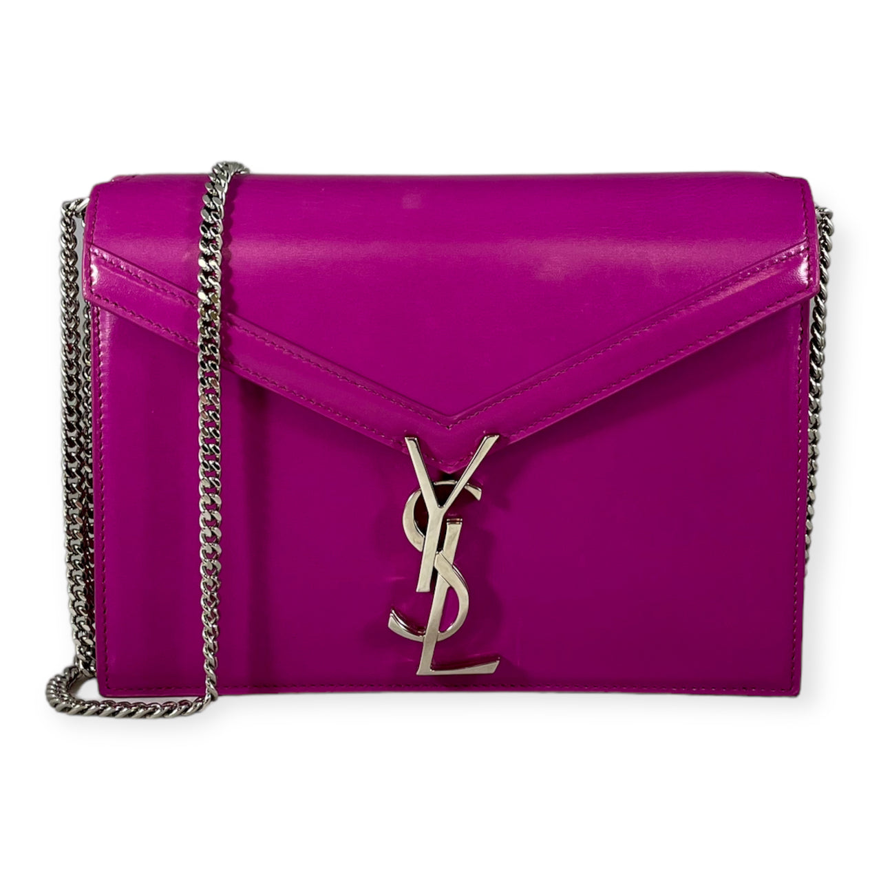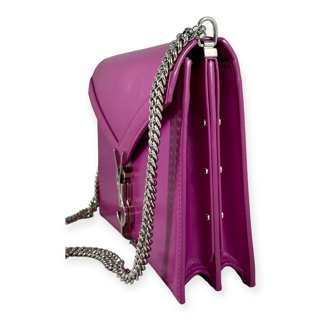 This is an authentic SAINT LAURENT Cassandra Bag in Fuchsia. This stunning bag is crafted of luxurious leather with silver-toned hardware. It features a chain-link shoulder/crossbody strap, a front envelope flap with the iconic YSL lock closure, and a partitioned black leather interior with one zipper pocket and one patch pocket.