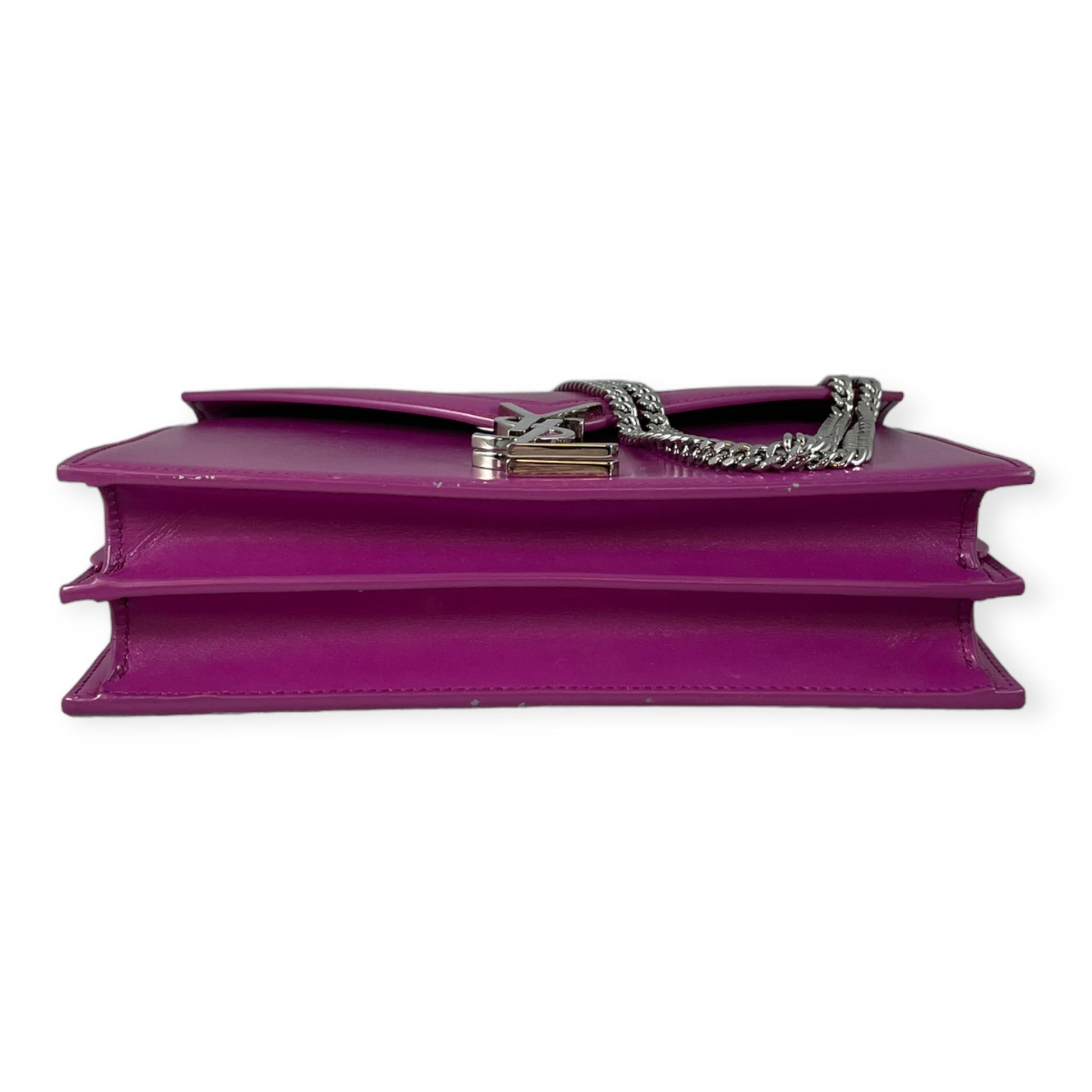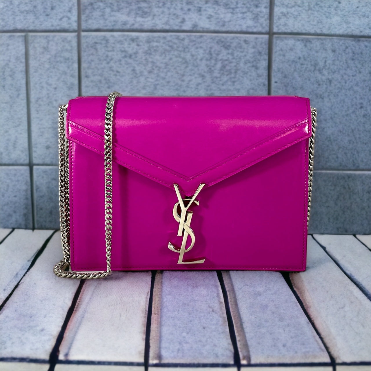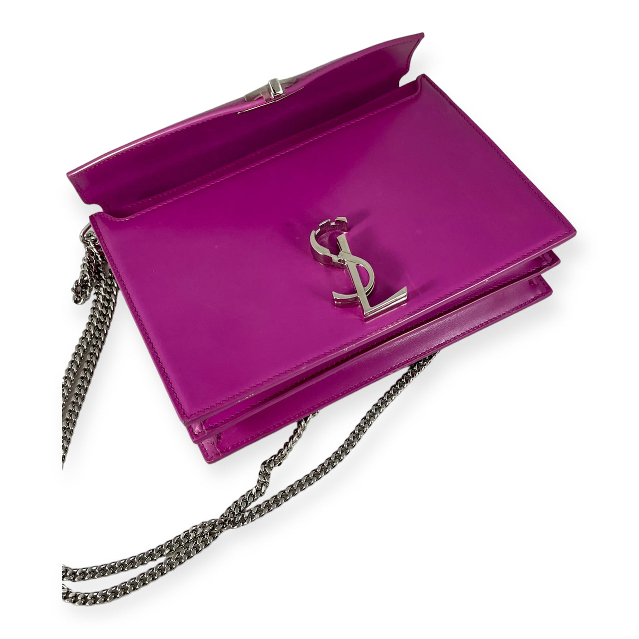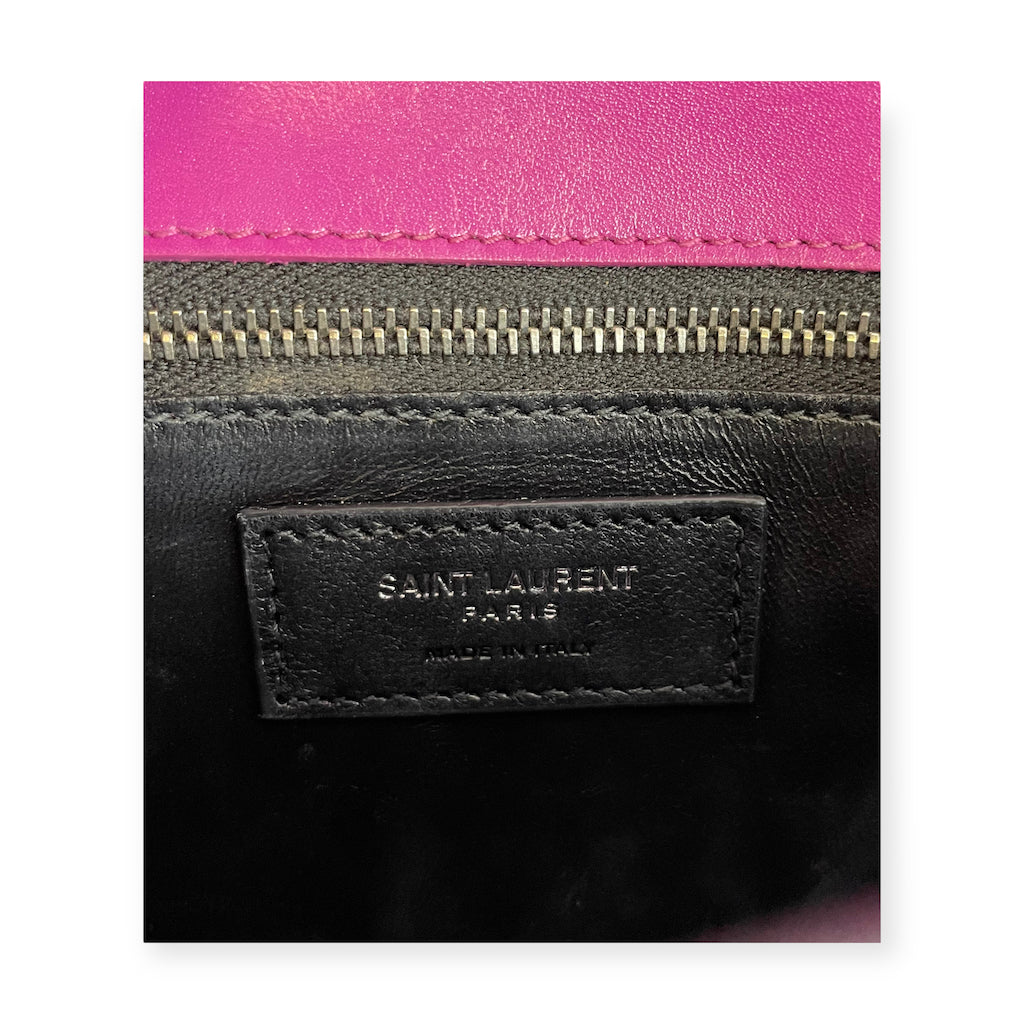 This is an authentic SAINT LAURENT Cassandra Bag in Fuchsia. This stunning bag is crafted of luxurious leather with silver-toned hardware. It features a chain-link shoulder/crossbody strap, a front envelope flap with the iconic YSL lock closure, and a partitioned black leather interior with one zipper pocket and one patch pocket.