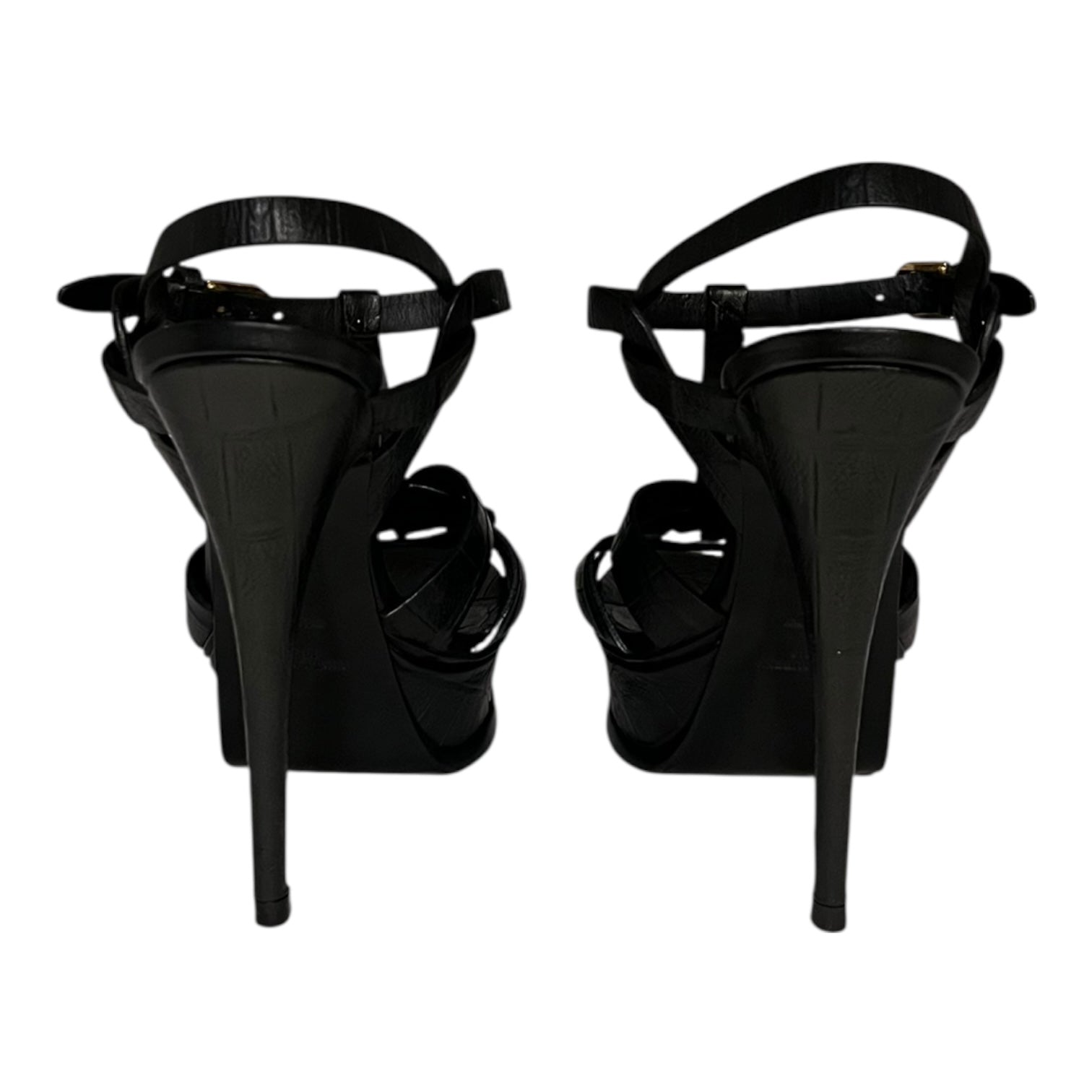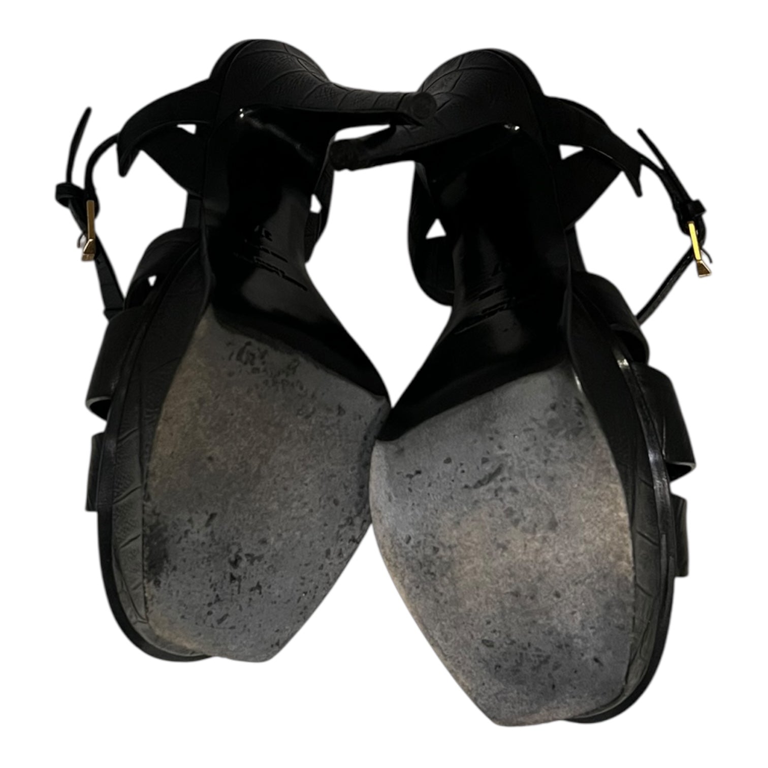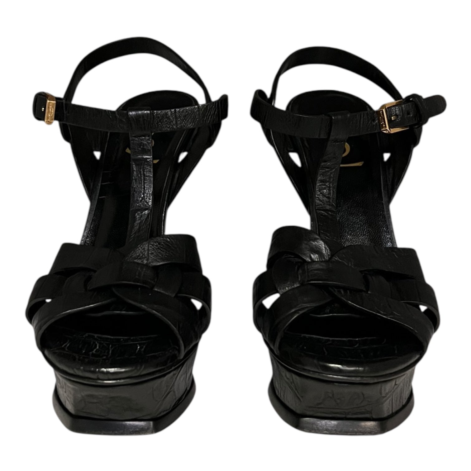 This authentic pair of SAINT LAURENT Embossed Tribute Sandal in black leather features a gold toned buckle closure and a five inch heel with a one inch platform.