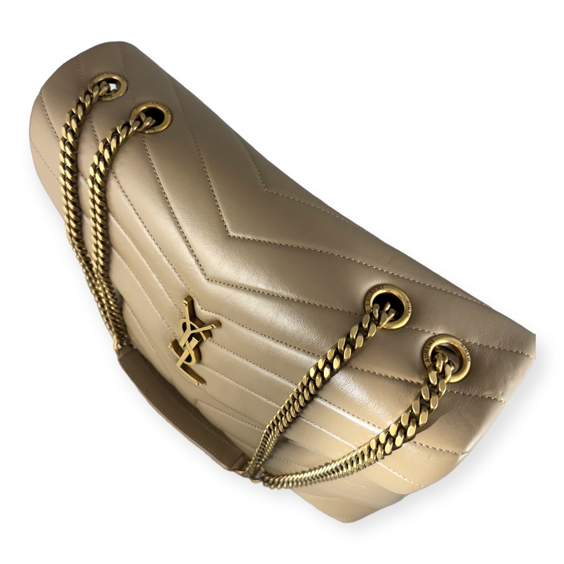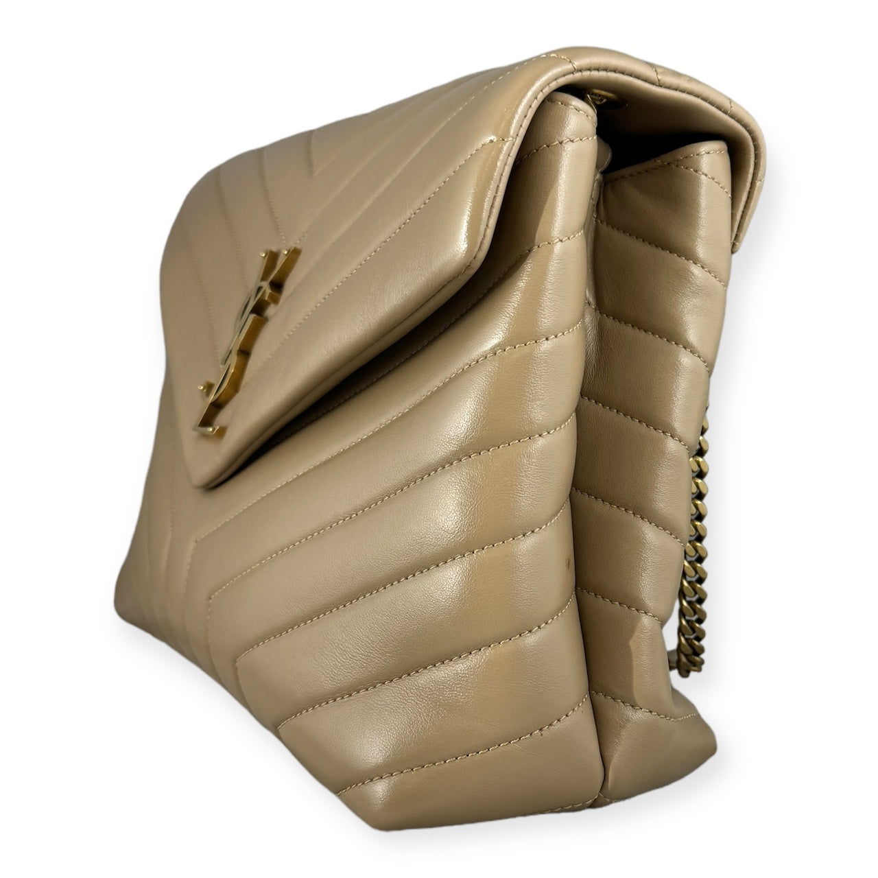 This is an authentic SAINT LAURENT Loulou Medium Bag in Nude. This timeless bag is crafted of chevron quilted calfskin leather with gold-toned hardware. It features a sliding chain-link crossbody/shoulder strap, an envelope crossover flap with a button-snap closure, and a matching leather interior with one patch pocket.