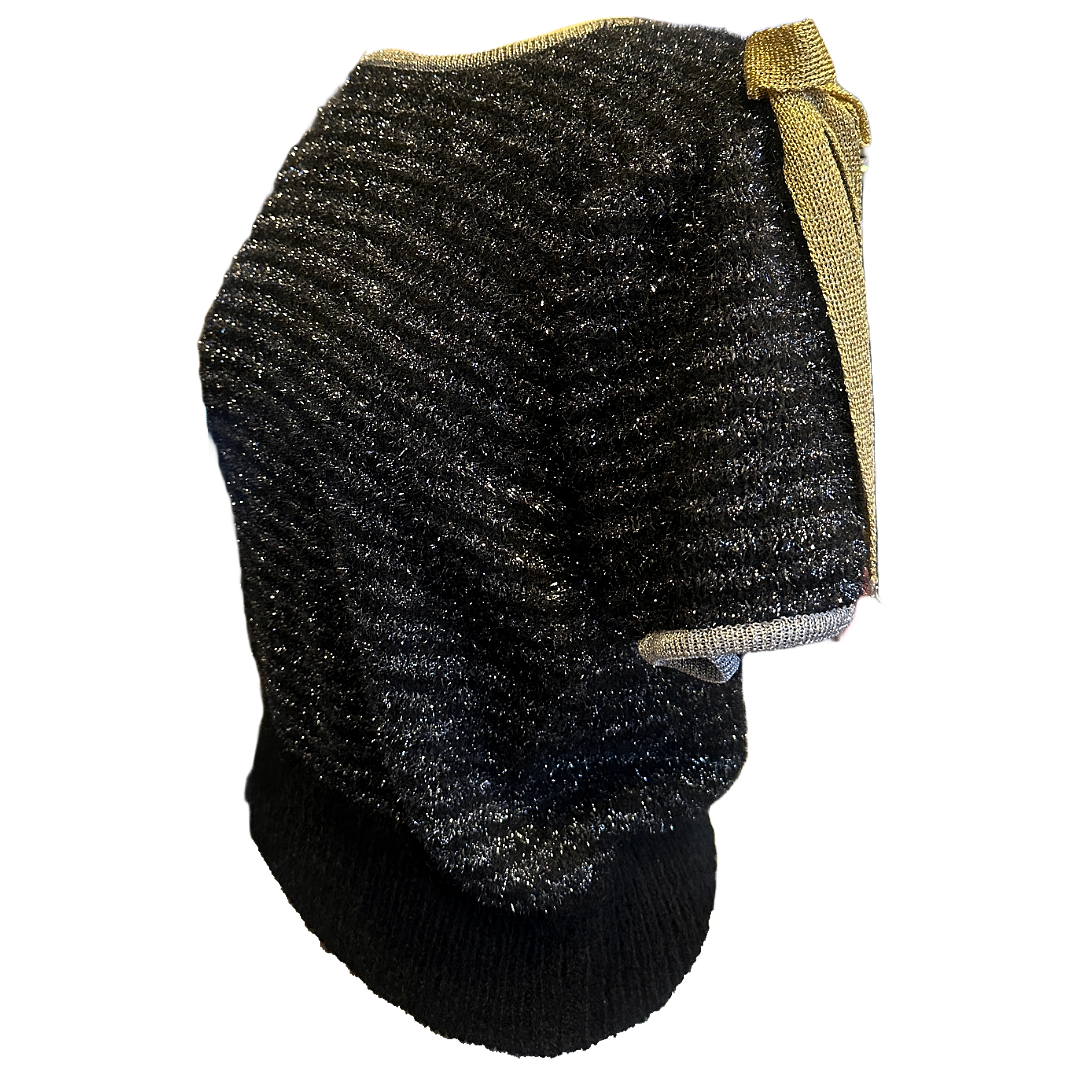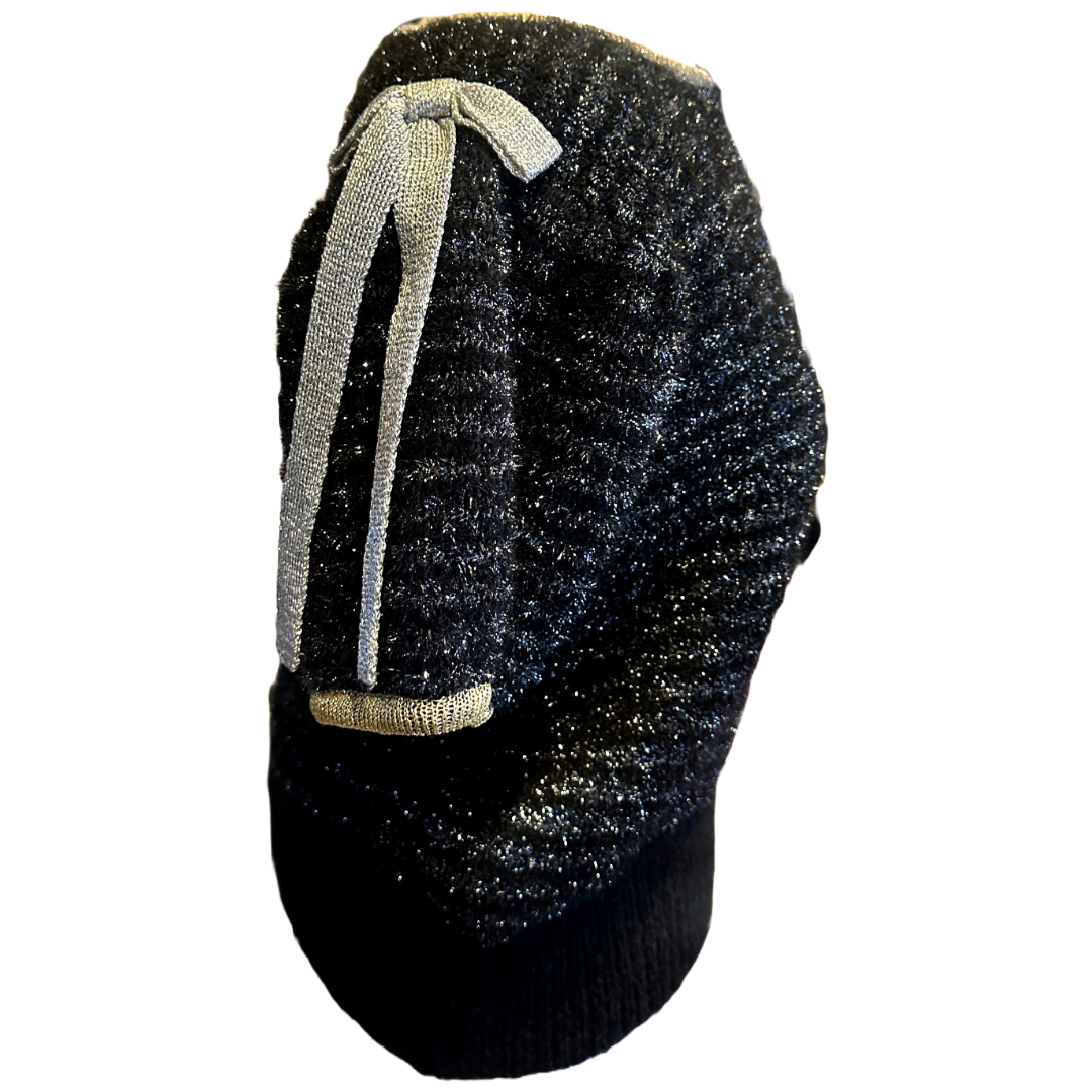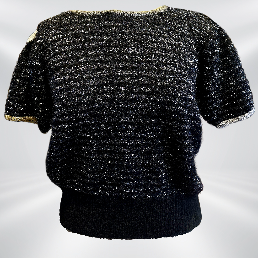 Elevate your wardrobe with the Saint Laurent Short-Sleeve Sweater, an exquisite piece in black adorned with shimmering silver metallic stripes. This chic sweater features a unique design with a playful silver bow on one shoulder and a contrasting gold bow on the other, adding a touch of elegance and edge. Perfect for day-to-evening transitions, the fitted silhouette and luxurious fabric make this sweater a standout piece, blending timeless style with a hint of Saint Laurent’s iconic glamour.