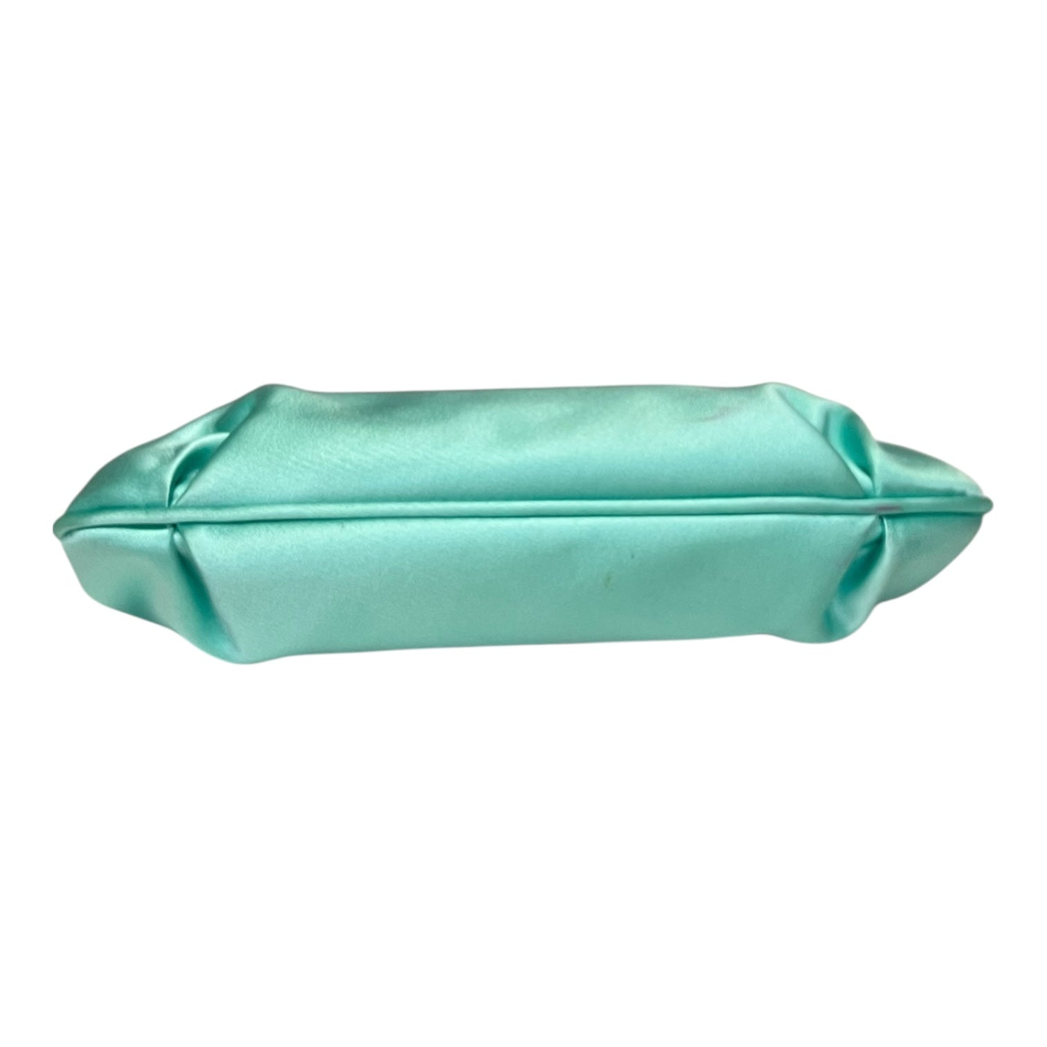 This authentic TIFFANY & CO. Pillow Clutch in blues satin with silver toned hardware features an engraved hinge lock clasp, tonal satin interior lining and one interior open flat pocket.