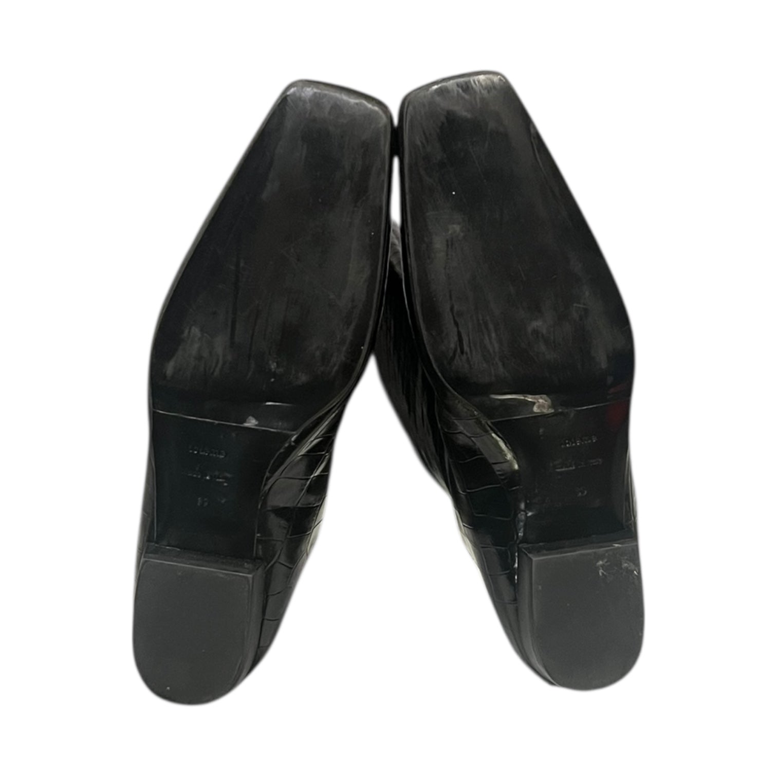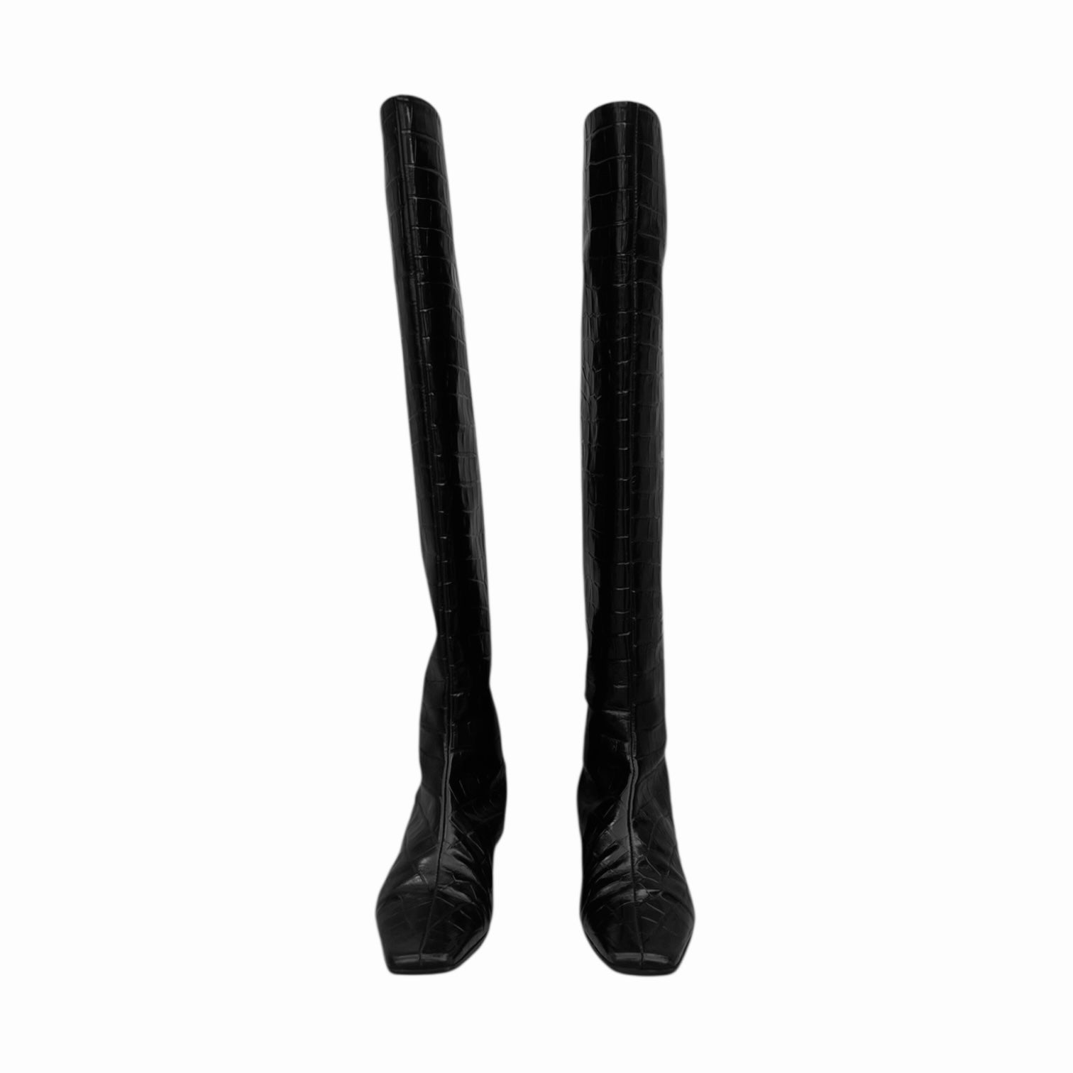 This authentic pair of TOTEME OTK boots in black croc embossed leather features a tapered square toe, 0.75 inch heel, and a tonal zipper enclosure.