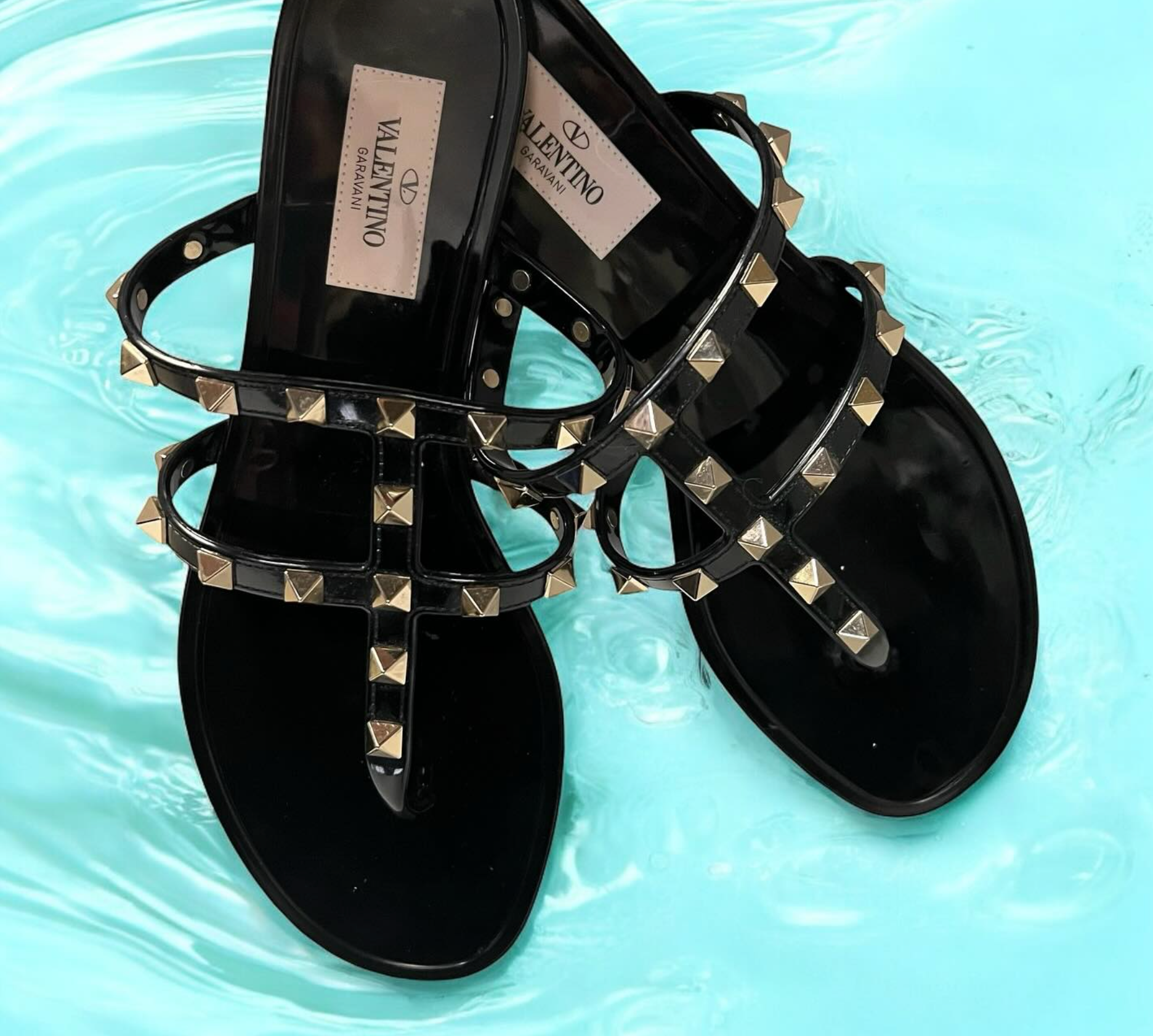VALENTINO Rockstud Jelly Sandals in Black, Size 37, are a stylish blend of comfort and luxury. Featuring gleaming pyramid studs, these sandals bring Valentino’s signature edge to a classic thong silhouette. Crafted with a synthetic upper, lining, and sole, they offer both durability and effortless chic. Perfect for warm weather, these Italian-made designer sandals are a must-have for any fashion-forward wardrobe. Ideal for casual or beachwear, they deliver a sleek and polished look with every step.