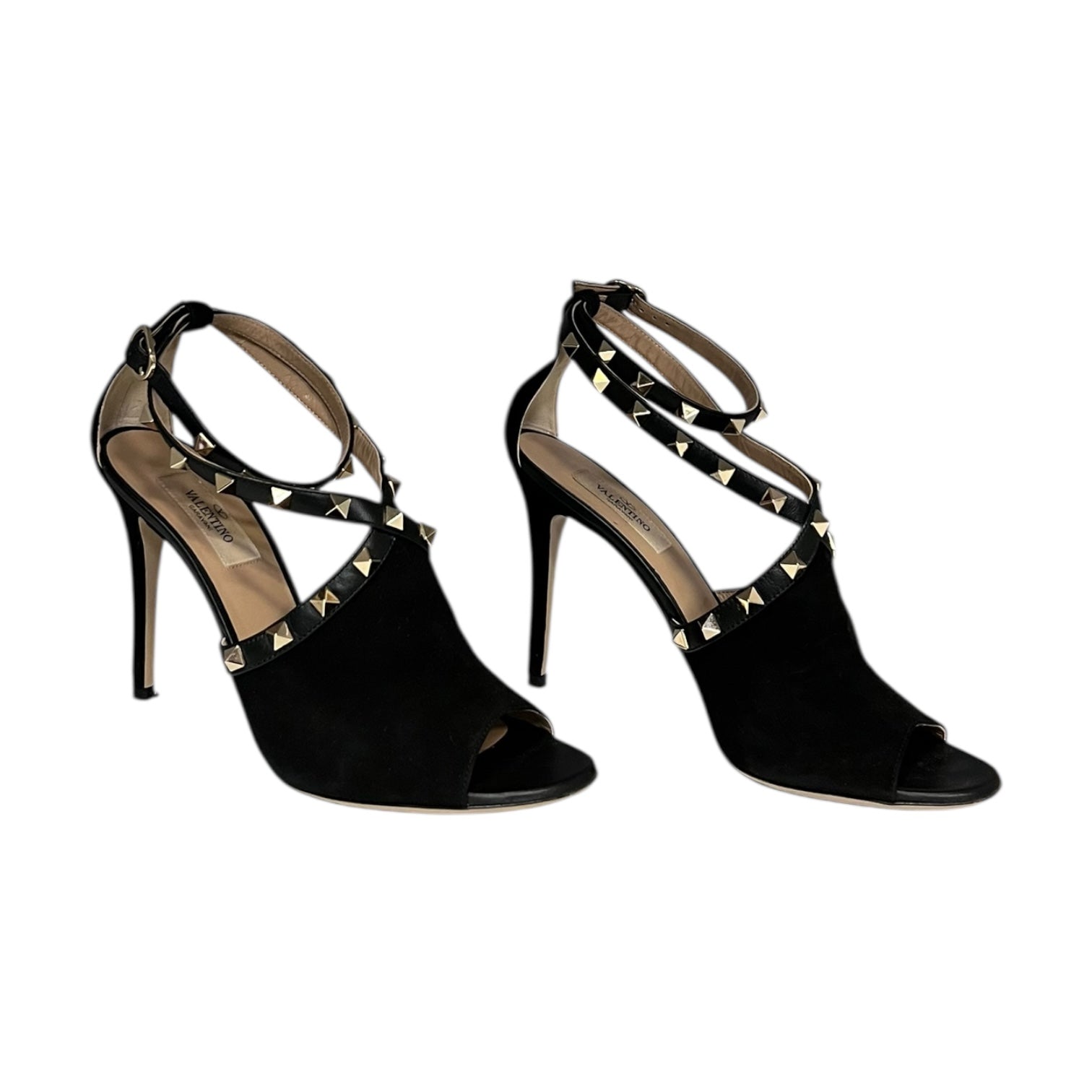 This is an authentic pair of VALENTINO GARAVANI Rockstud Suede Glove Sandal in Black feature an ankle strap, a peep toe, nude leather interior, a 4 inch stiletto heel, gold studs, and a gold buckle enclosure.