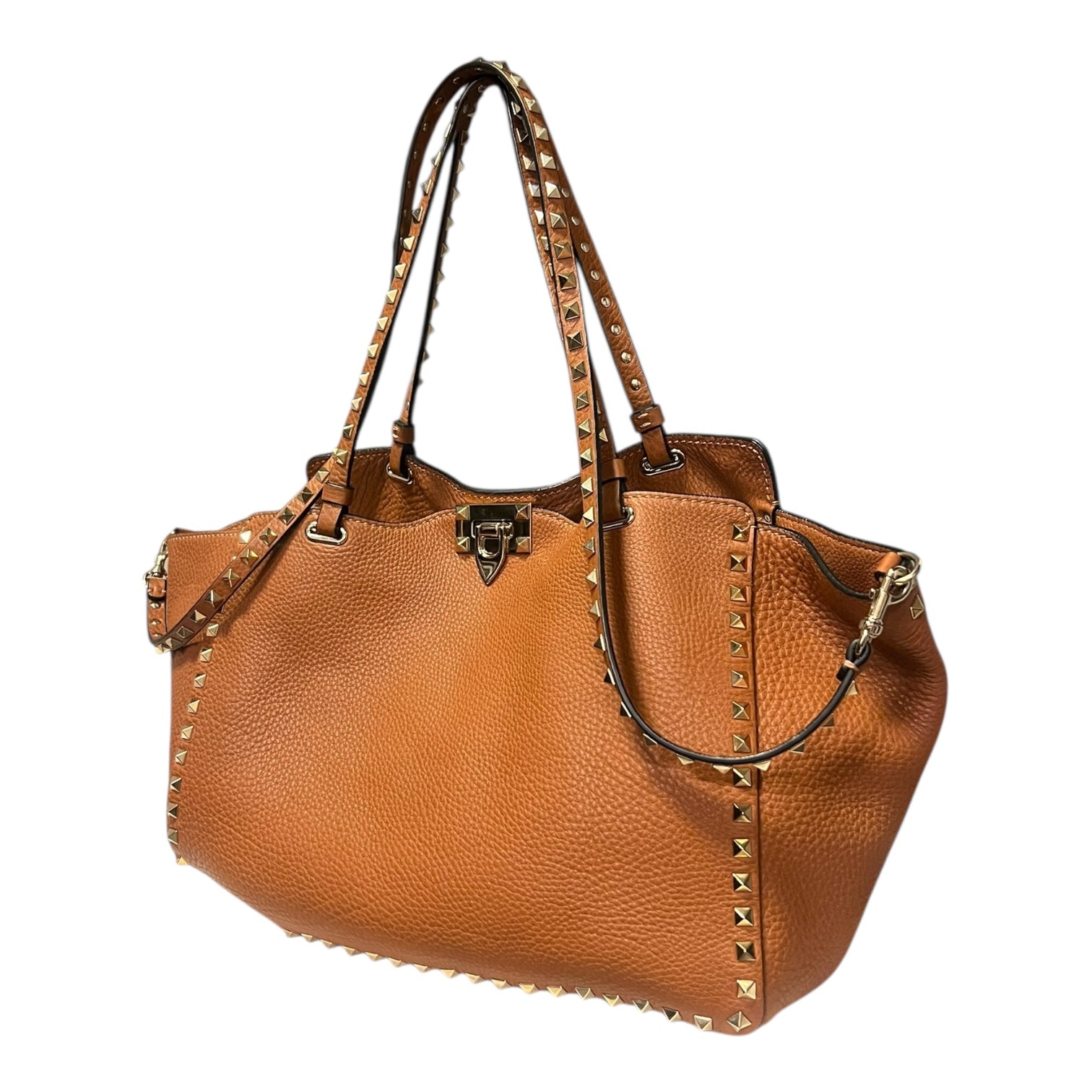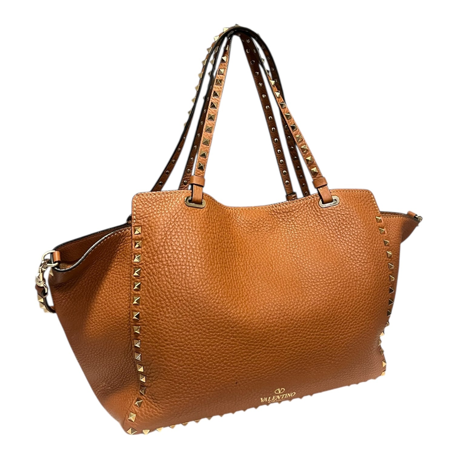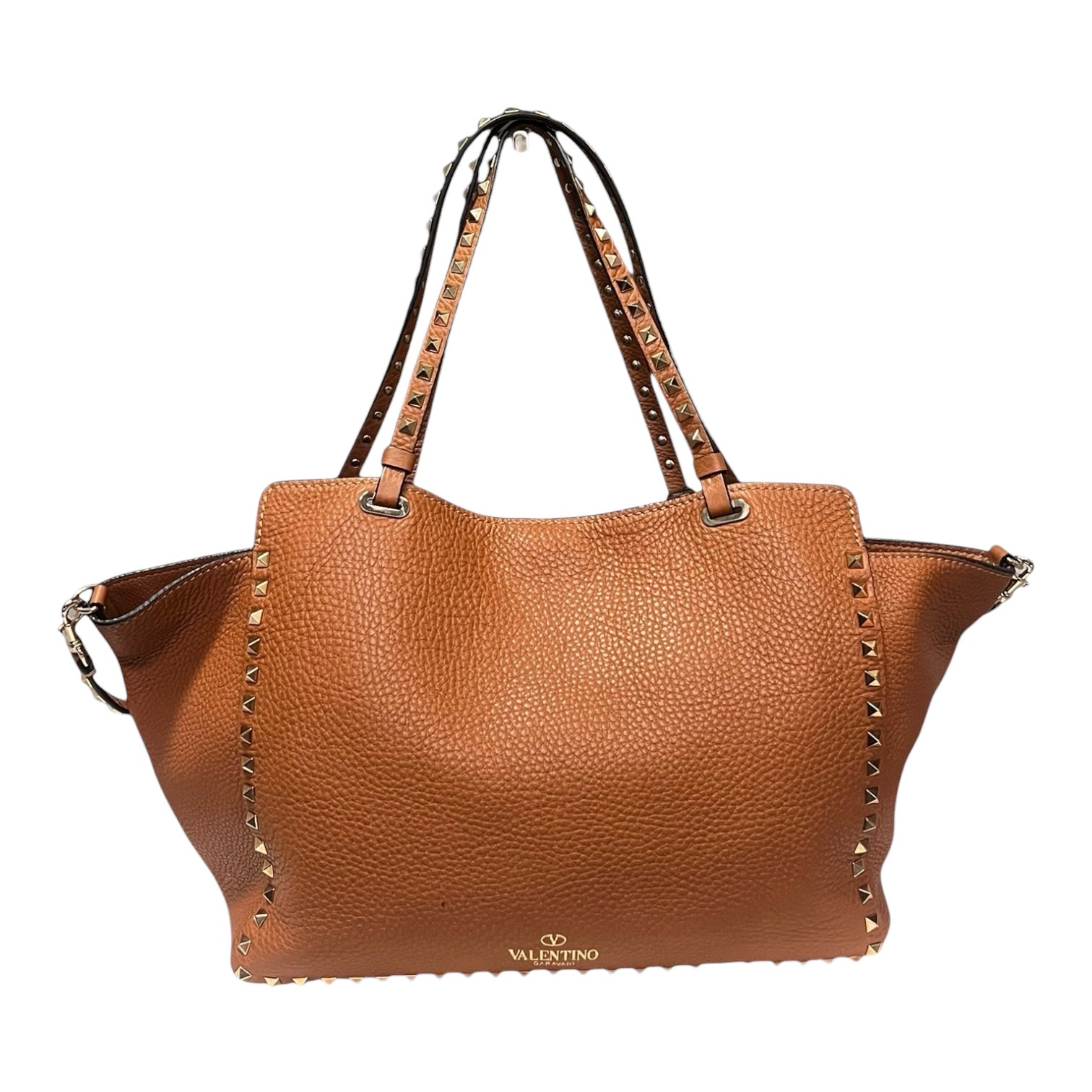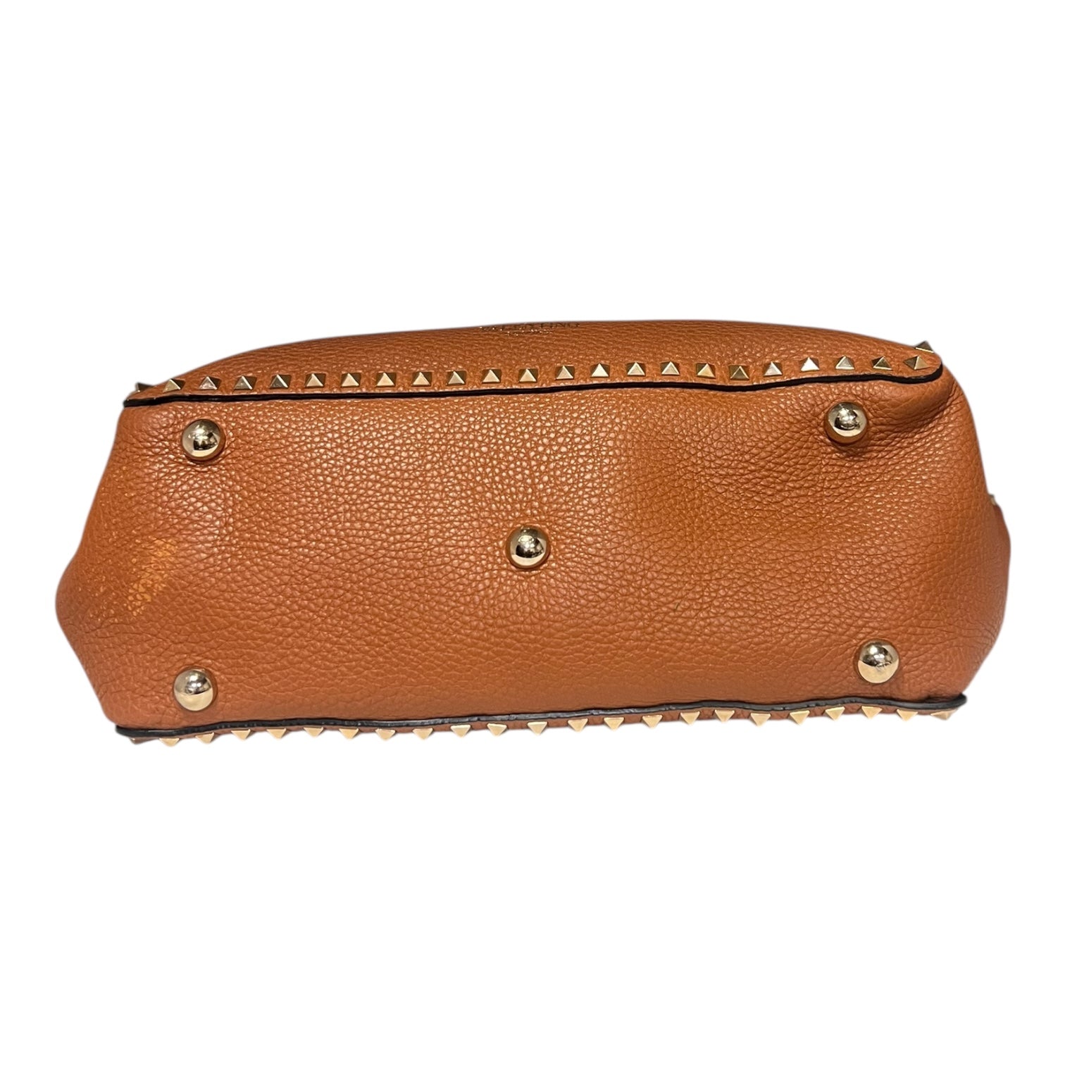 This authentic VALENTINO GARAVANI Rockstud Tote in Scotch features soft grain leather, gold toned hardware studs along seams and straps of the bag, latch closure, an interior zipper pocket, small monogramed logo, 2 shoulder straps, and a detachable crossbody strap.