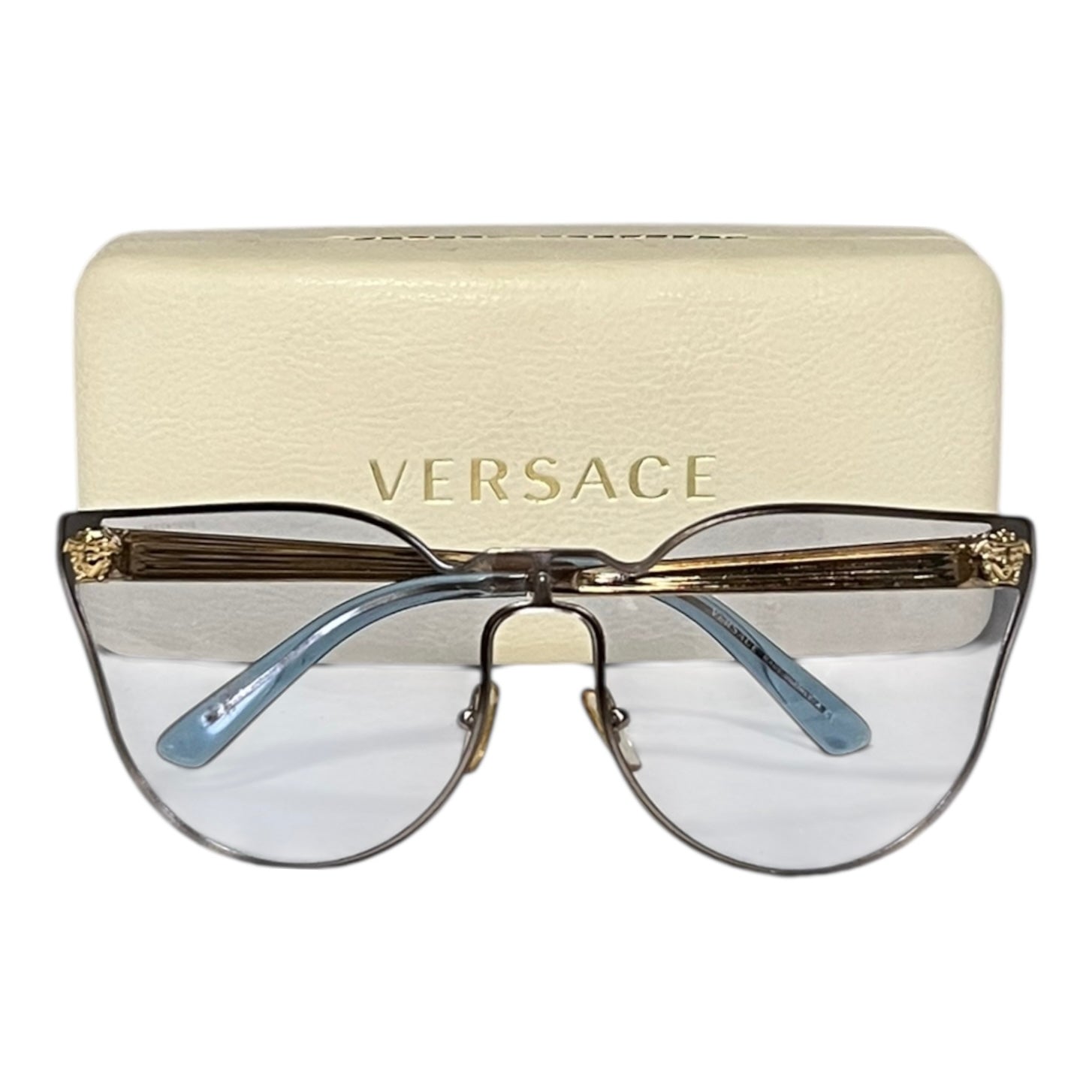 This pair of authentic VERSACE Medusa Cat Eye Sunglasses in Lilac feature a soft gold toned frame and lilac tinted lenses.
