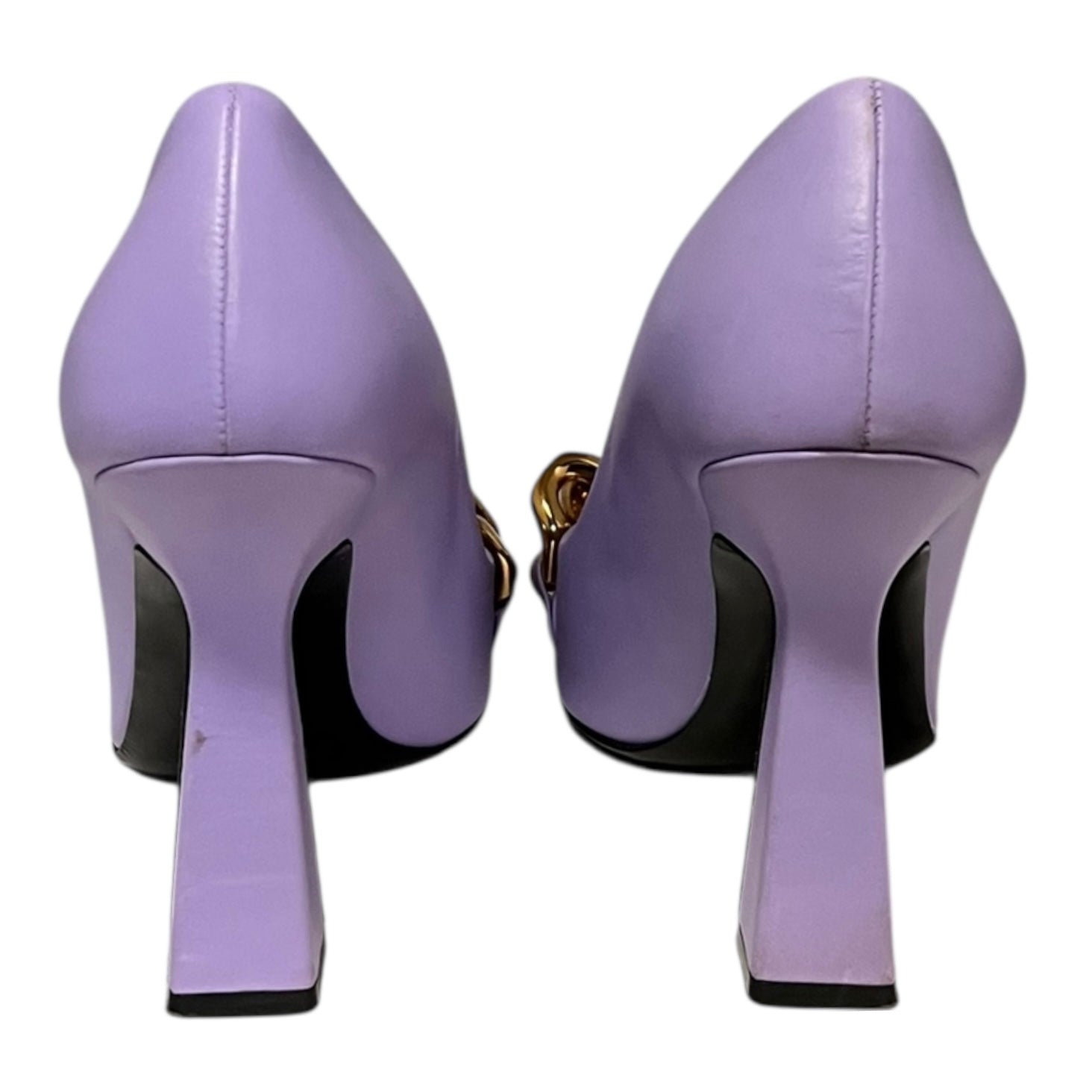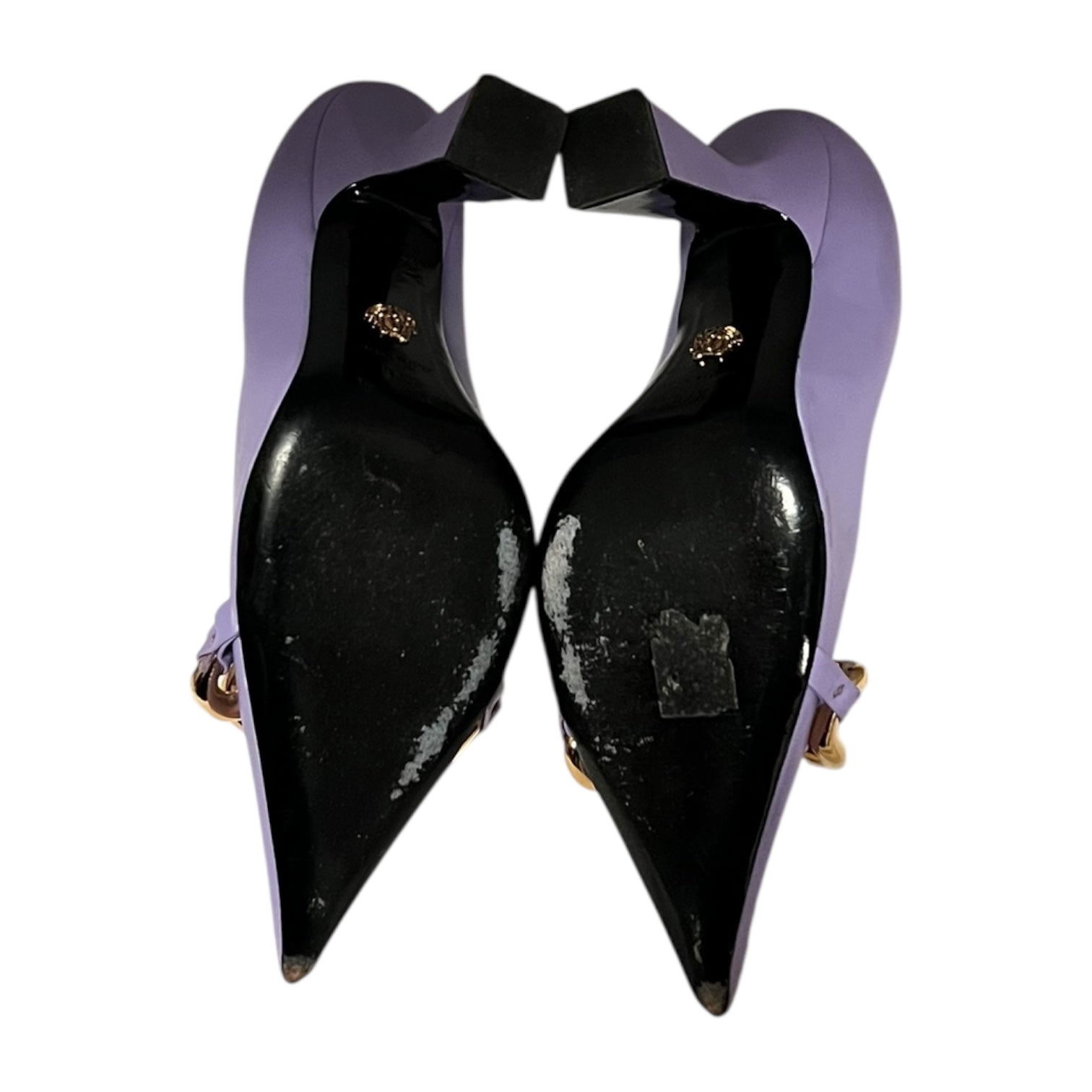 This authentic pair of VERSACE Medusa Chain Pumps in lavender leather with gold tone hardware feature a link chain across the toe, a sculpted four inch heel, and a pointed toe.